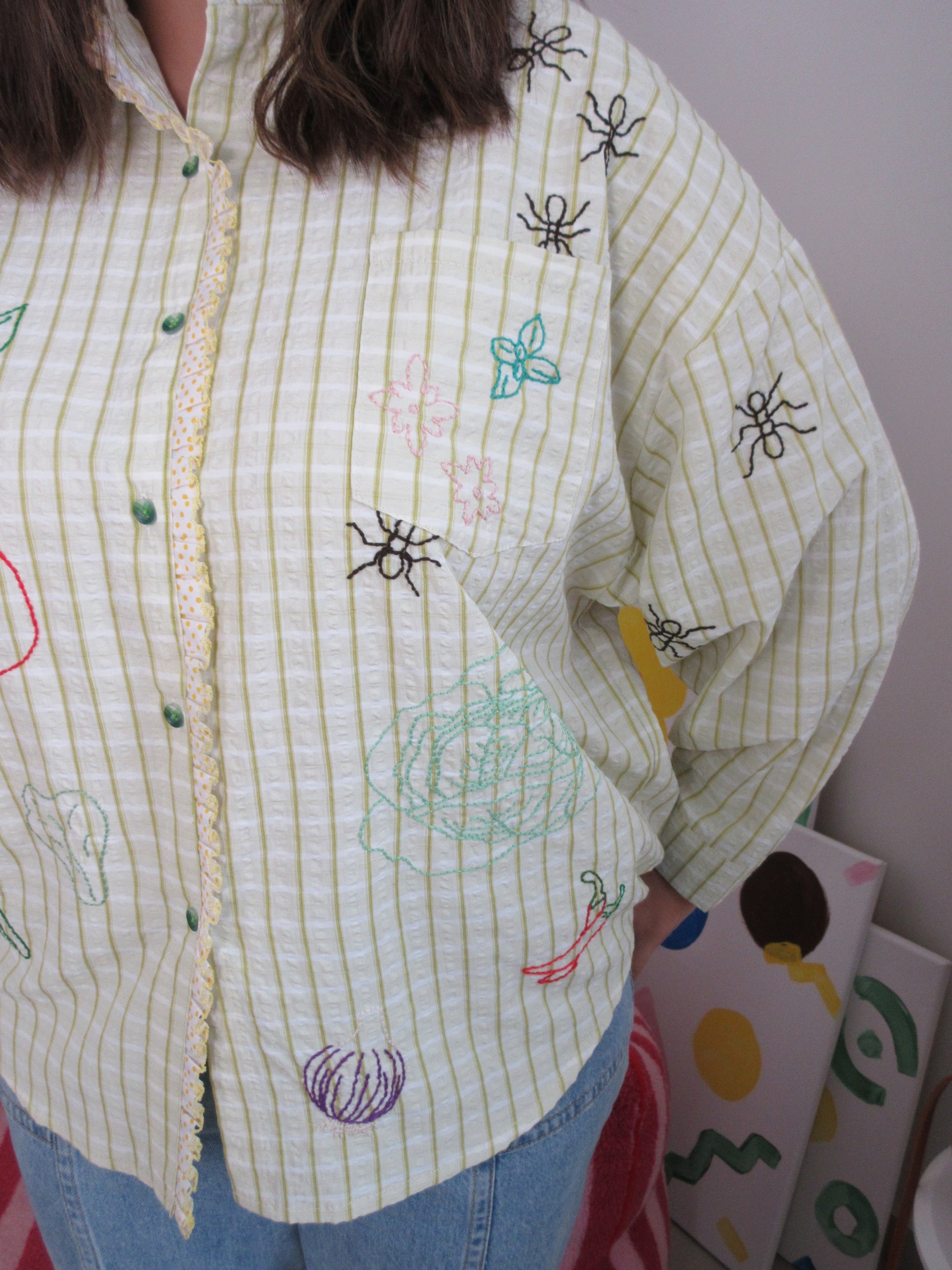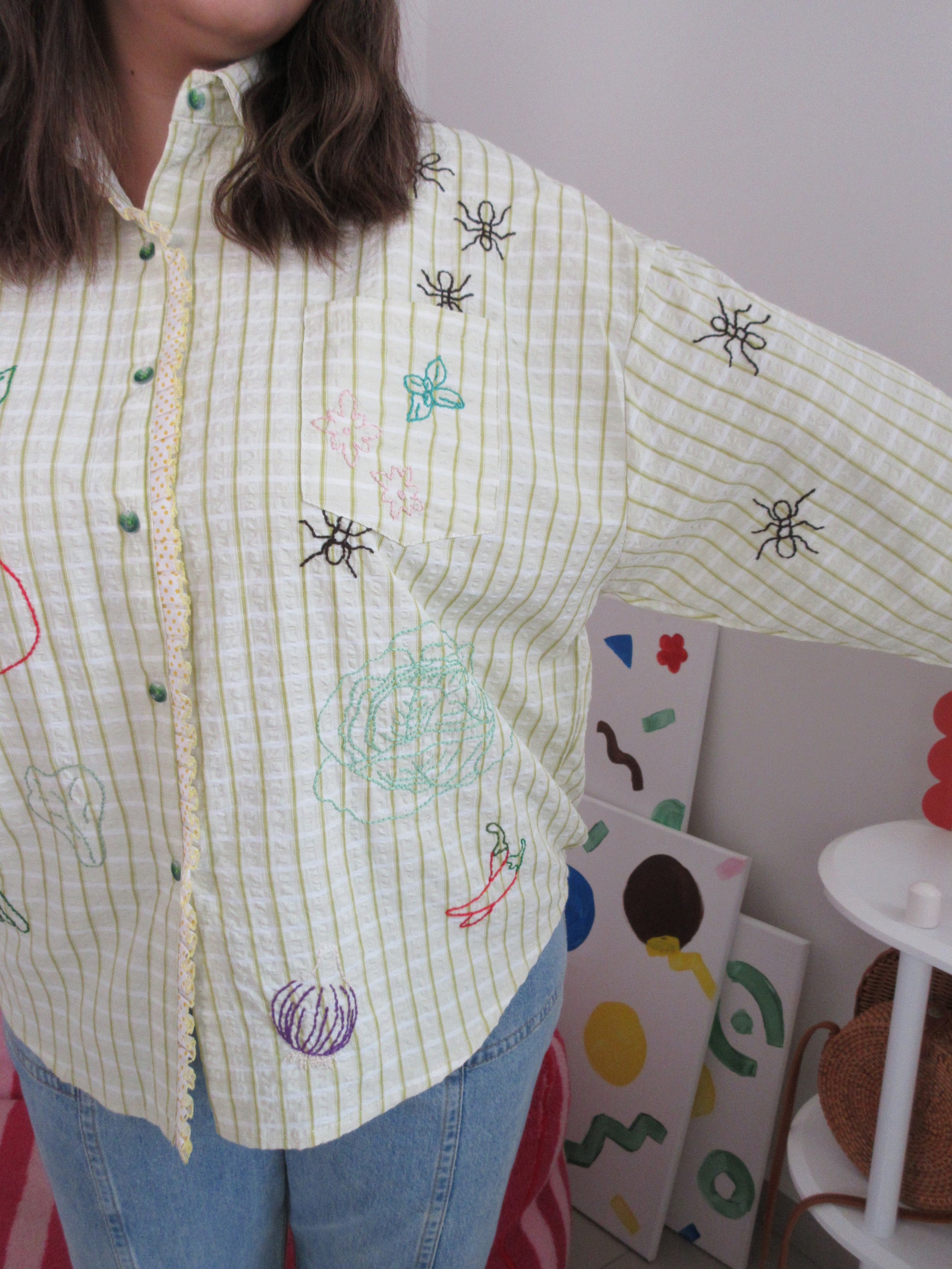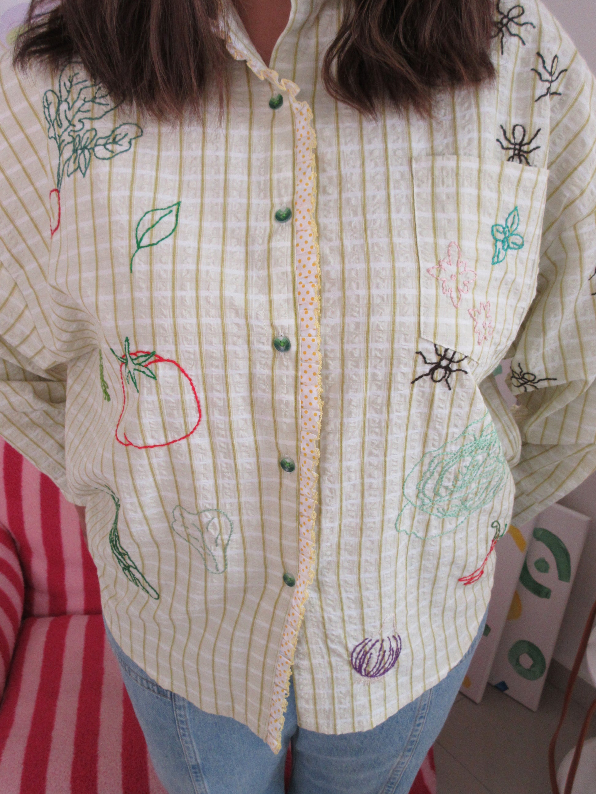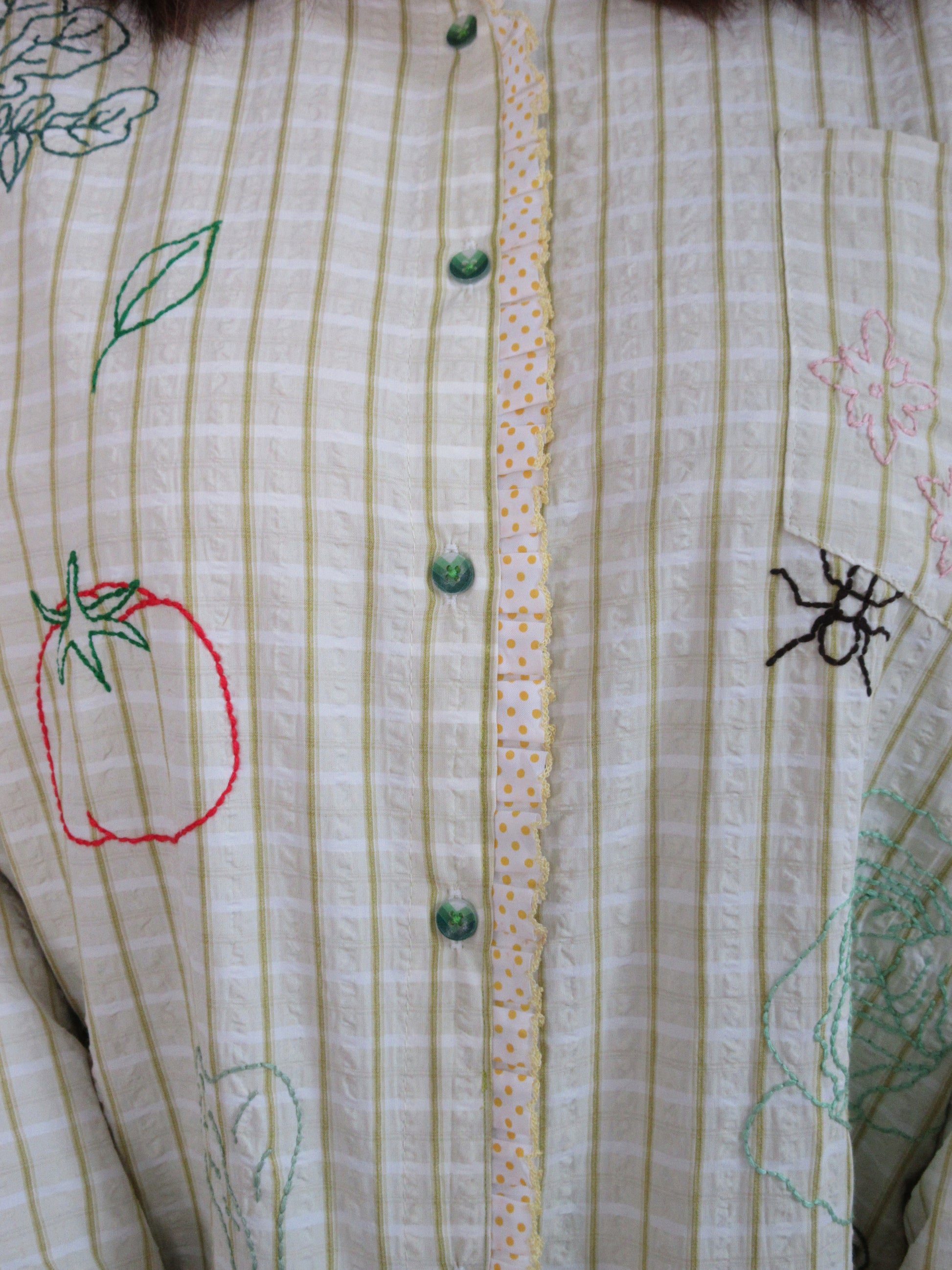 Green seersucker stripes trimmed with playful polka-dot ruffle lace — the Ants at the Picnic Top is crisp, retro, and full of charm. Tiny embroidered ants wander across veggies like they’ve claimed the picnic spread for themselves. Boxy, breezy, and effortlessly chic, it’s made for sunlit afternoons and the sweetest kind of mischief.