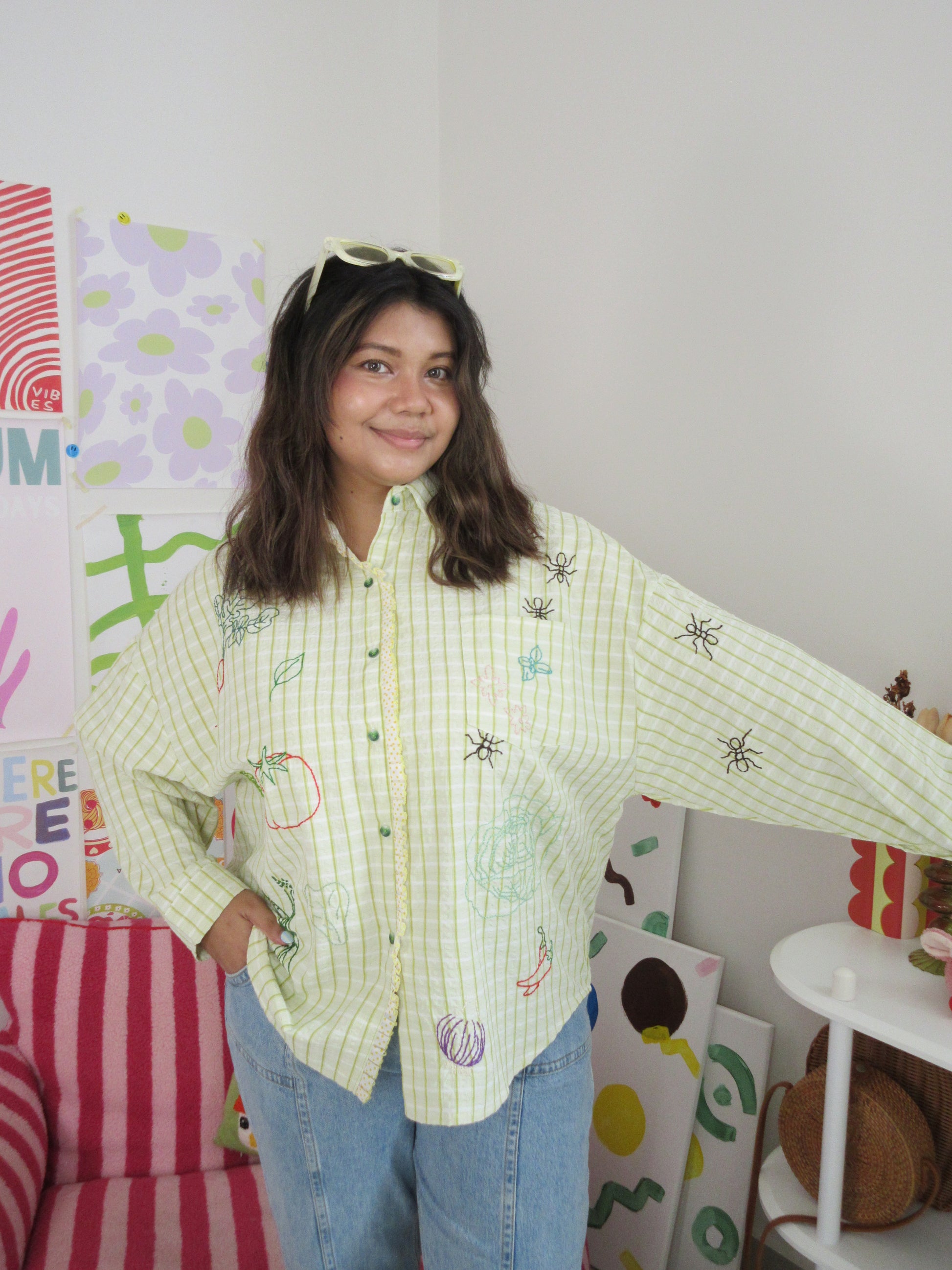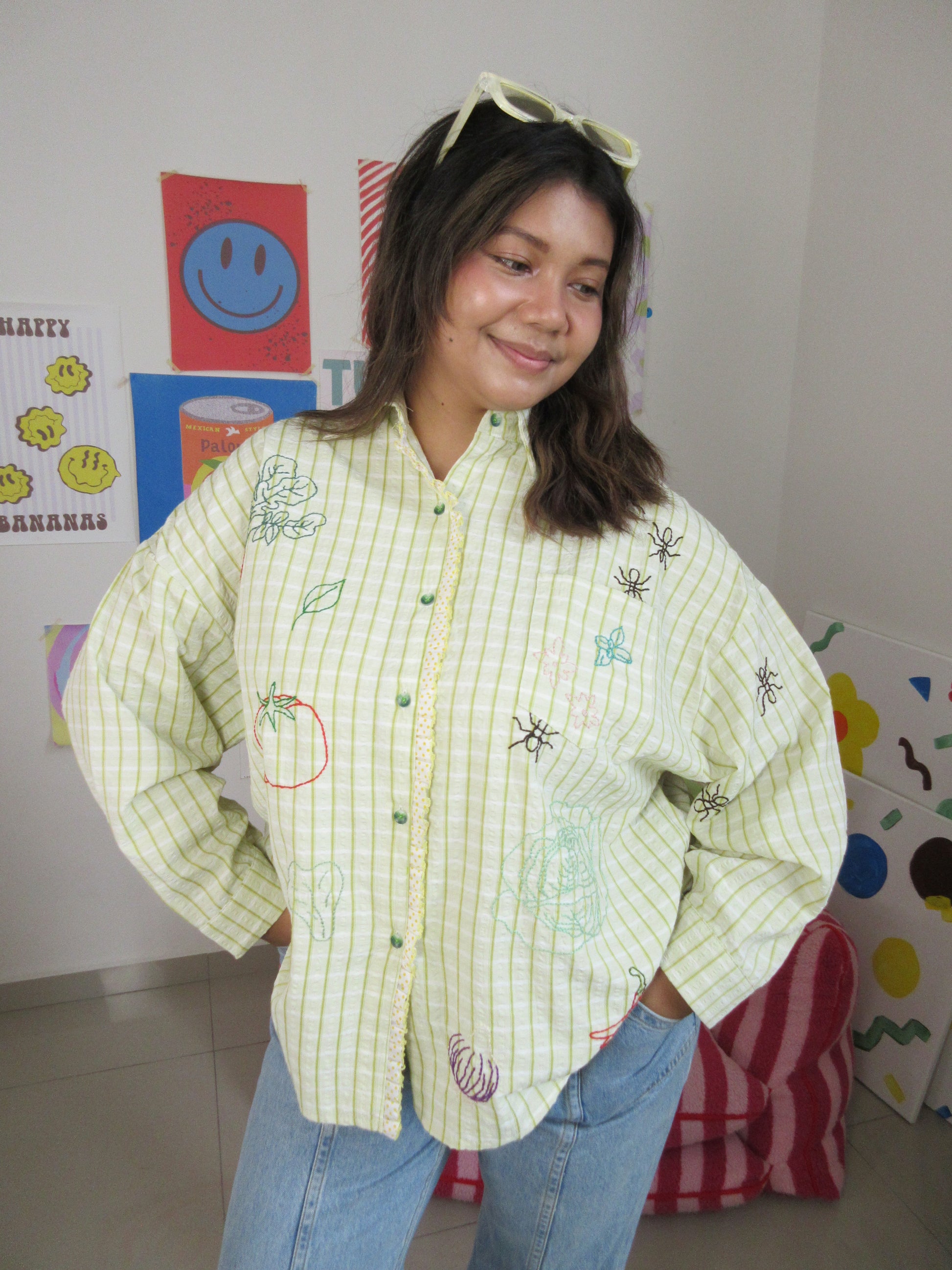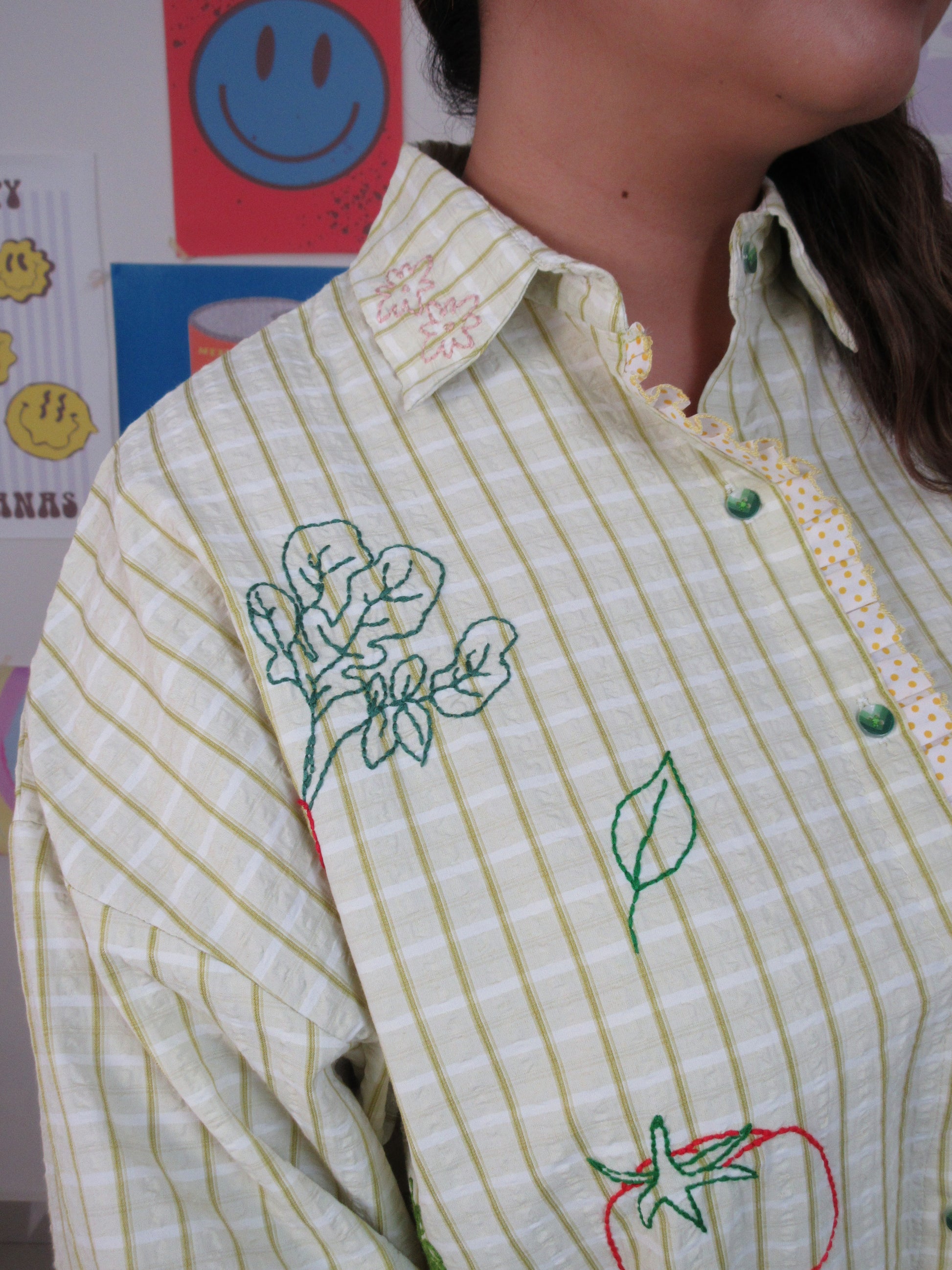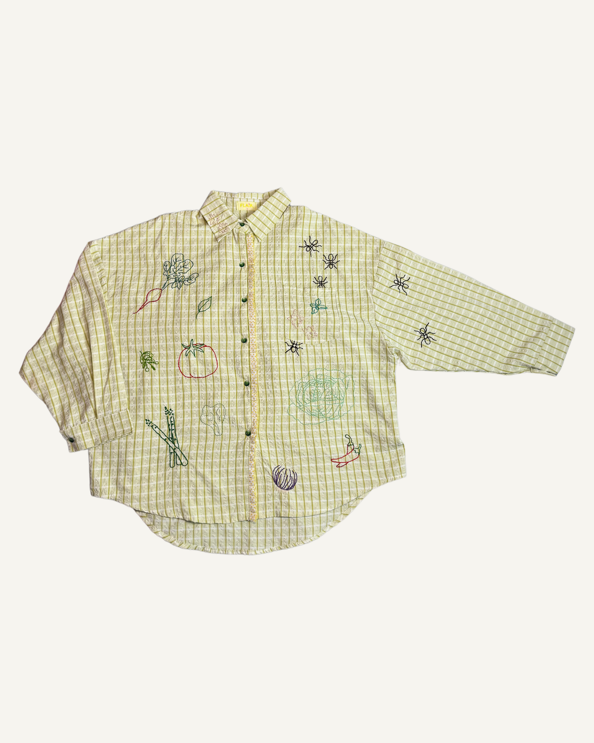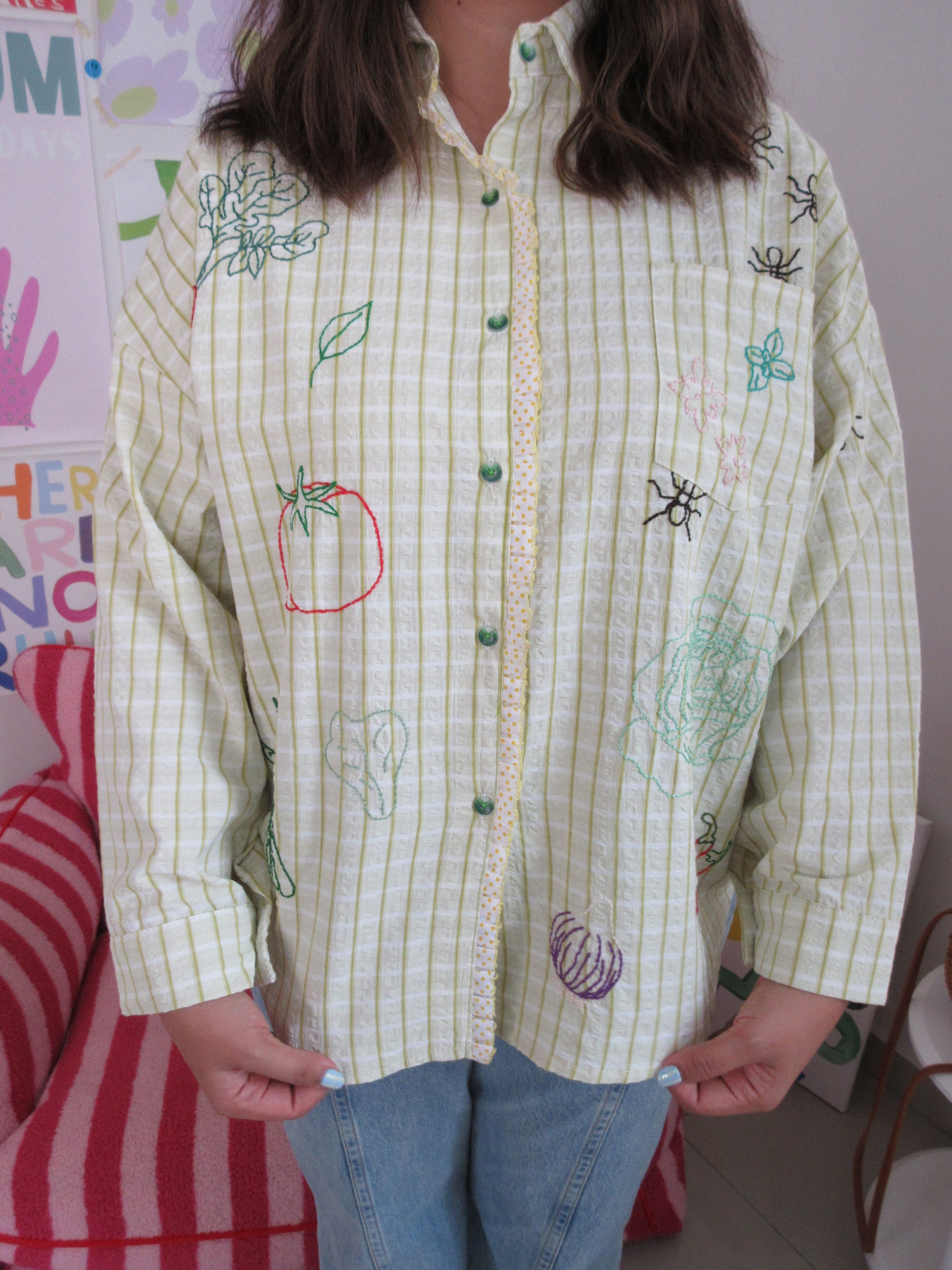 Green seersucker stripes trimmed with playful polka-dot ruffle lace — the Ants at the Picnic Top is crisp, retro, and full of charm. Tiny embroidered ants wander across veggies like they’ve claimed the picnic spread for themselves. Boxy, breezy, and effortlessly chic, it’s made for sunlit afternoons and the sweetest kind of mischief.