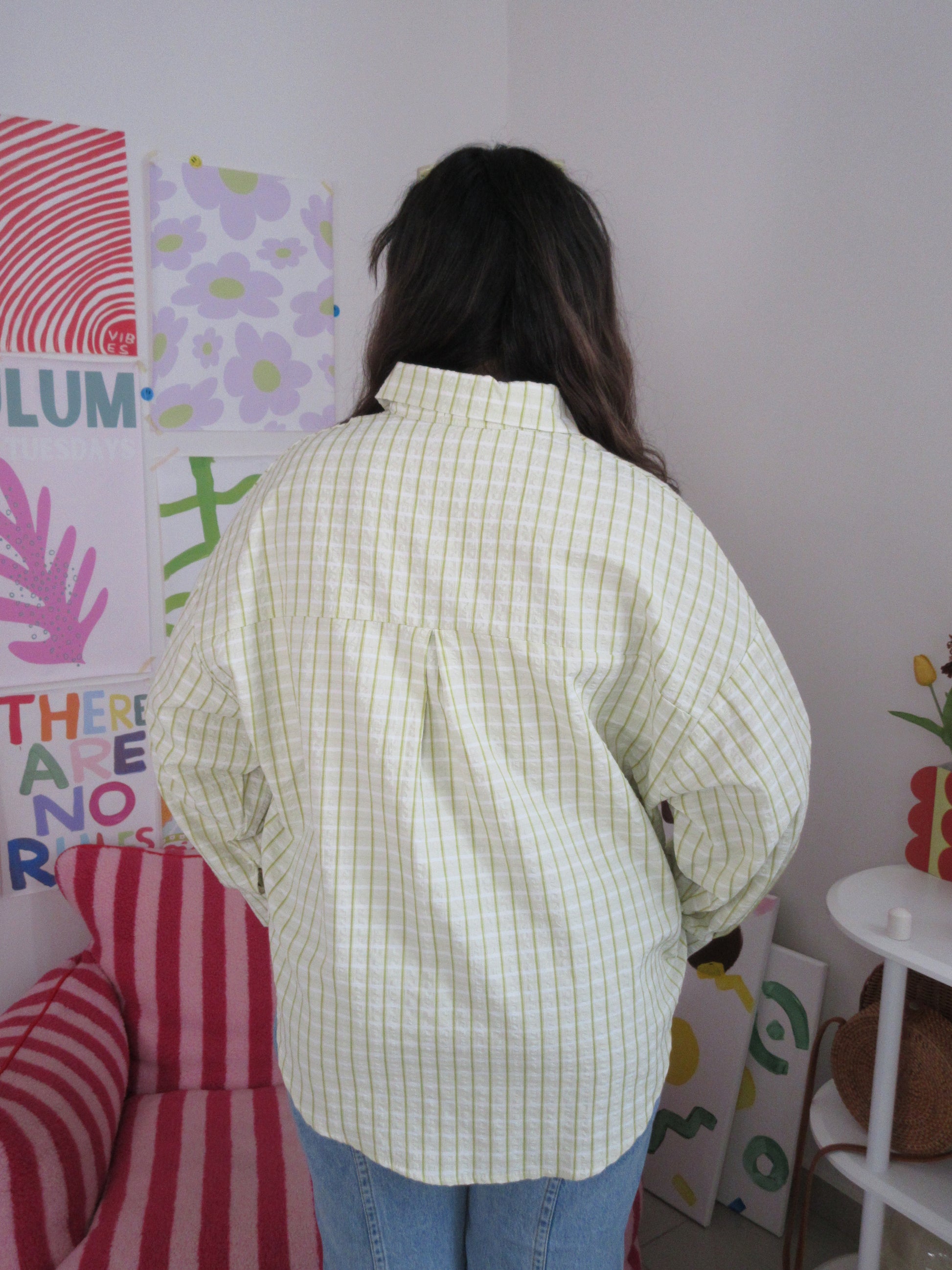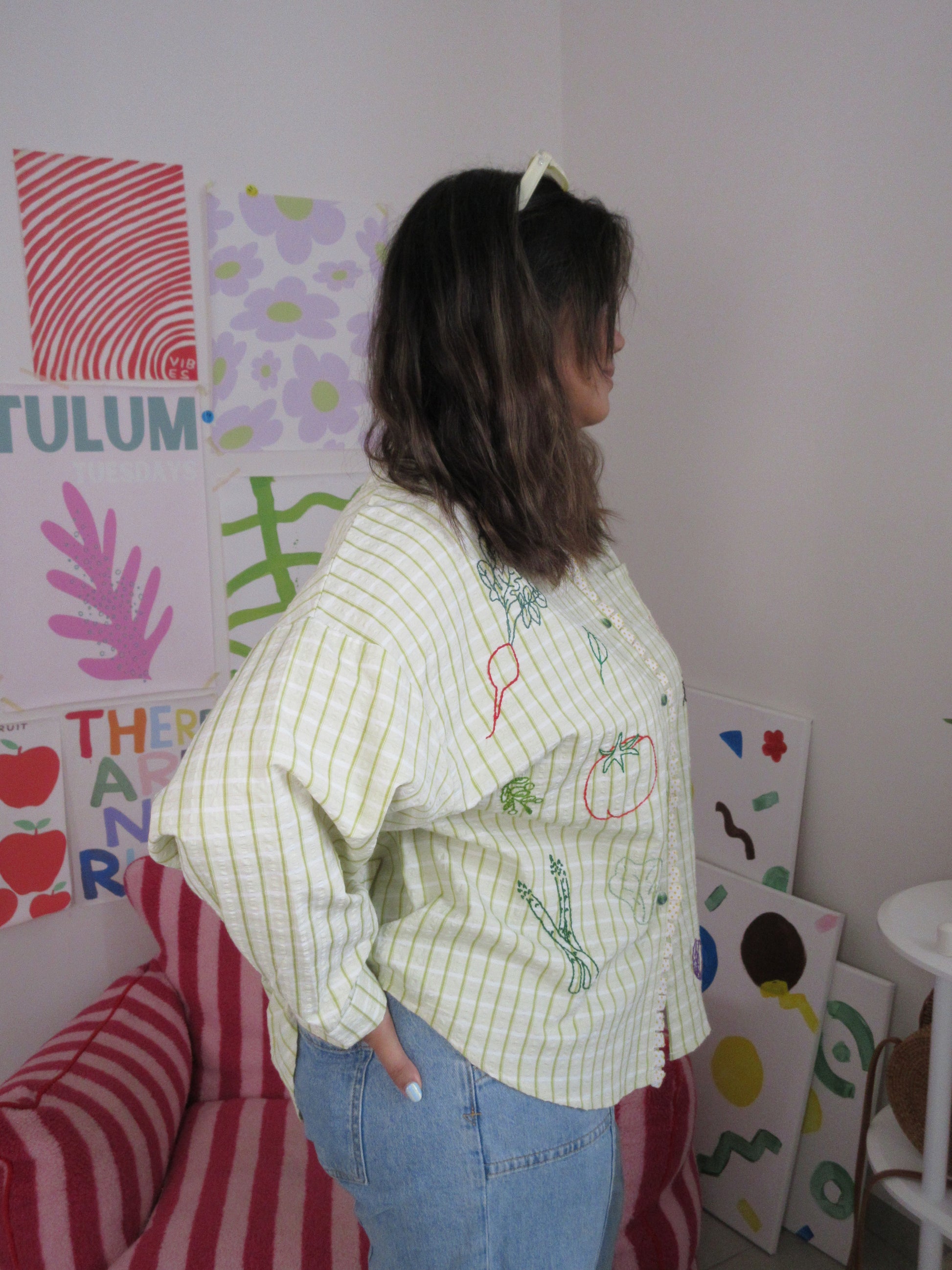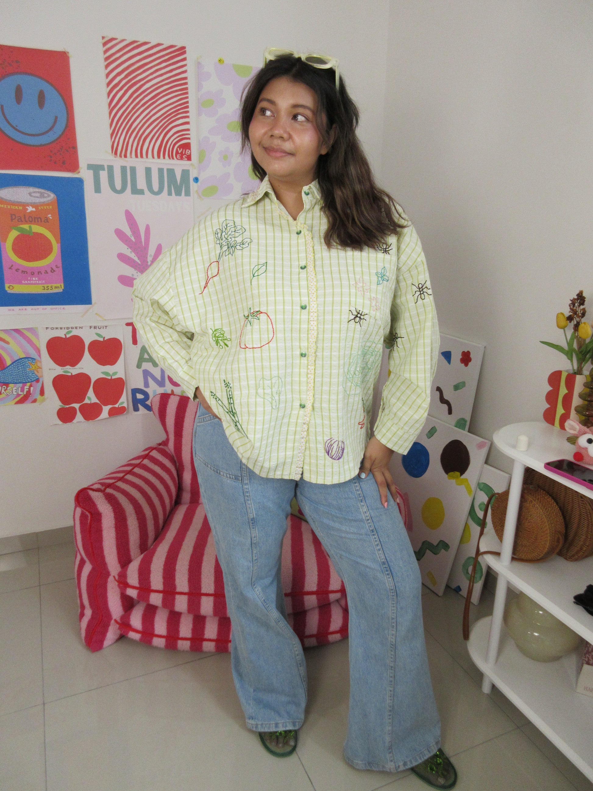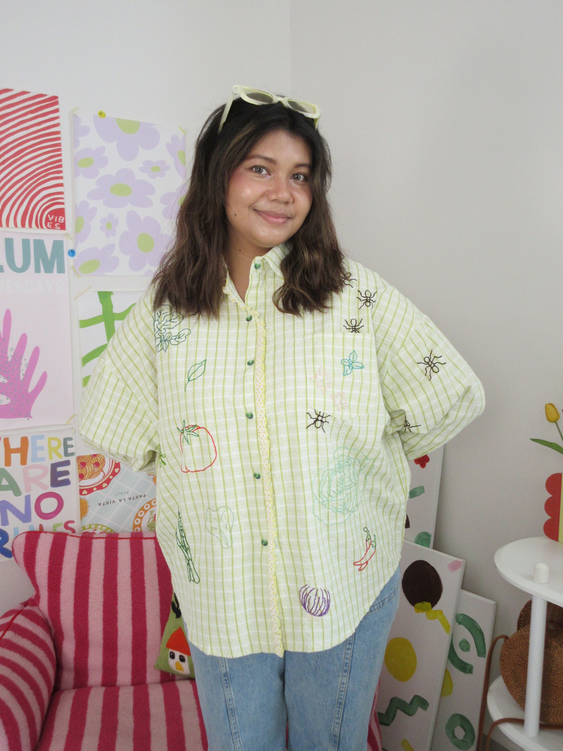 Green seersucker stripes trimmed with playful polka-dot ruffle lace — the Ants at the Picnic Top is crisp, retro, and full of charm. Tiny embroidered ants wander across veggies like they’ve claimed the picnic spread for themselves. Boxy, breezy, and effortlessly chic, it’s made for sunlit afternoons and the sweetest kind of mischief.