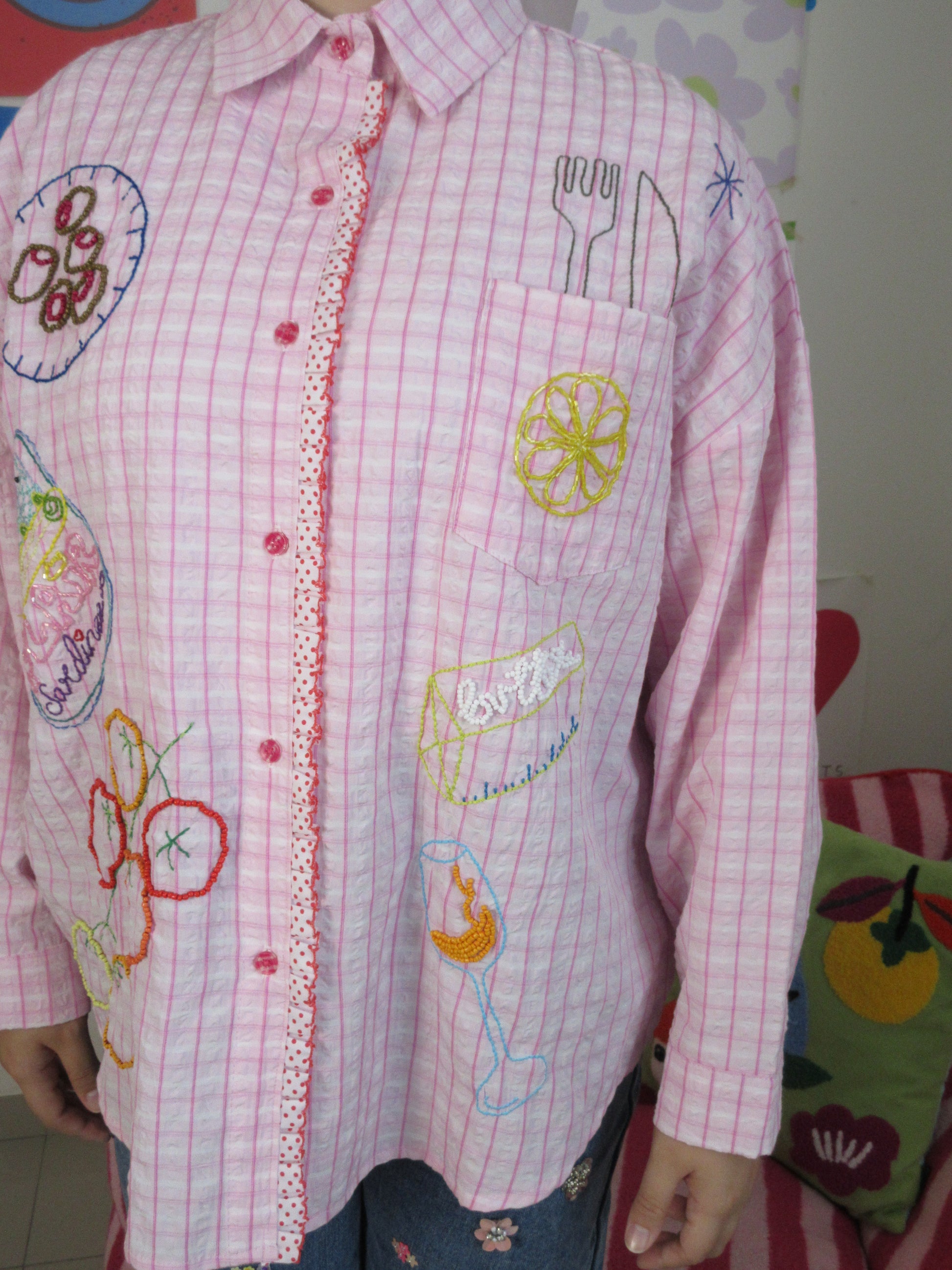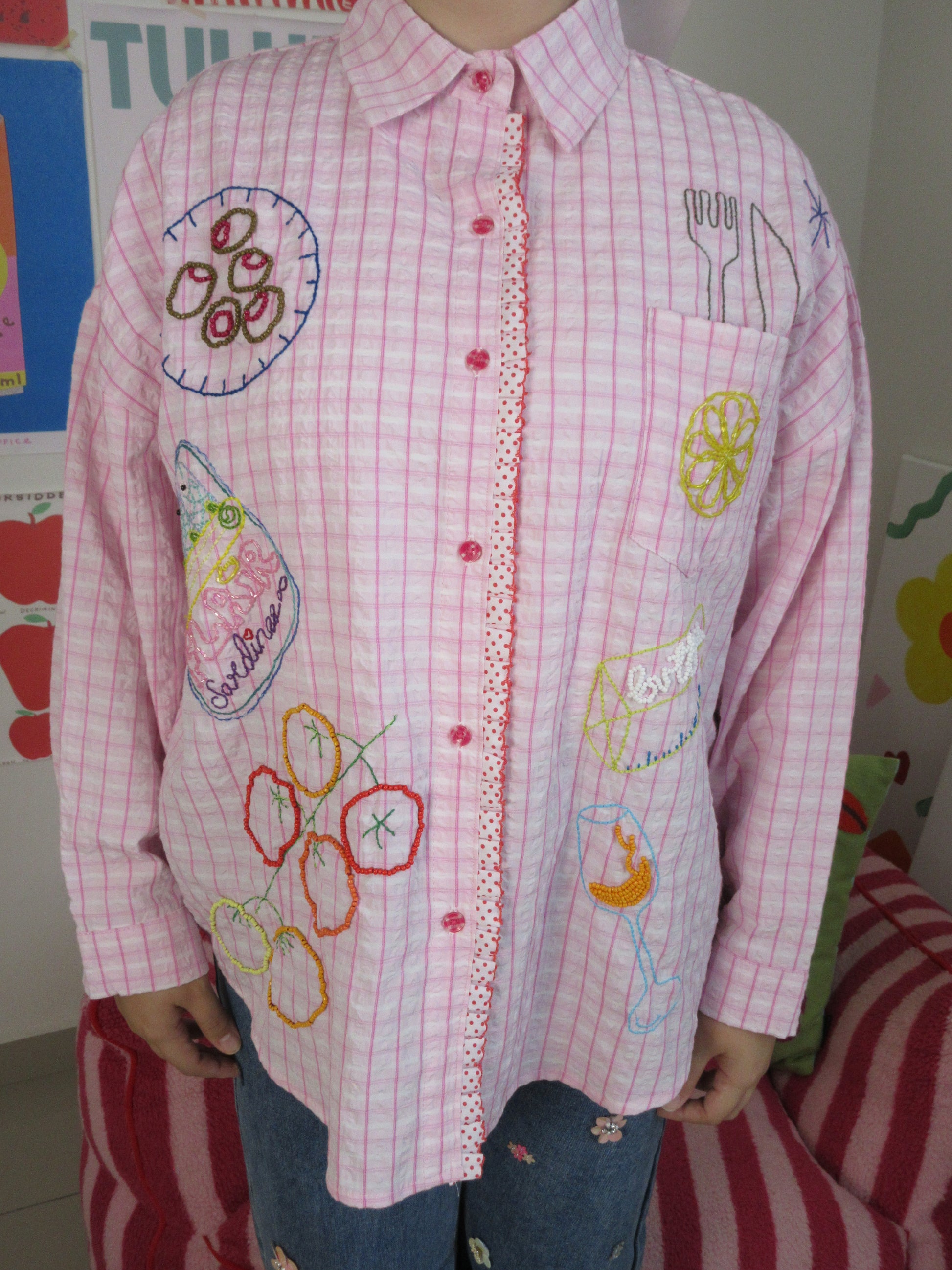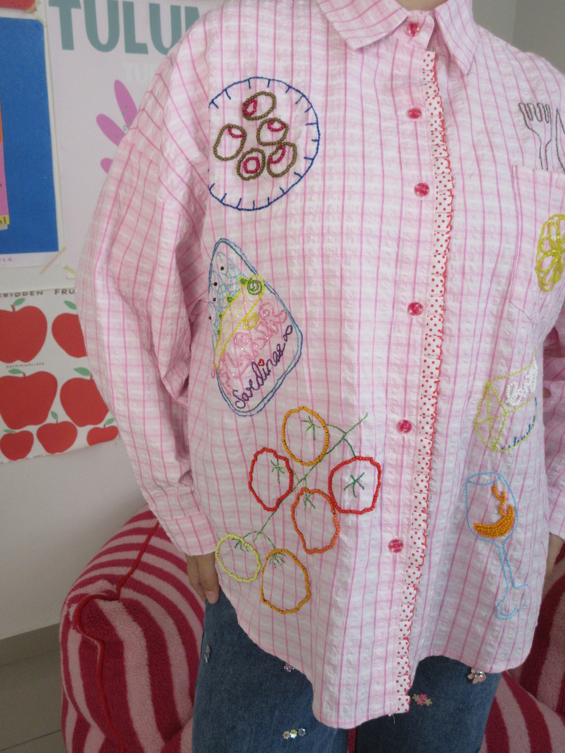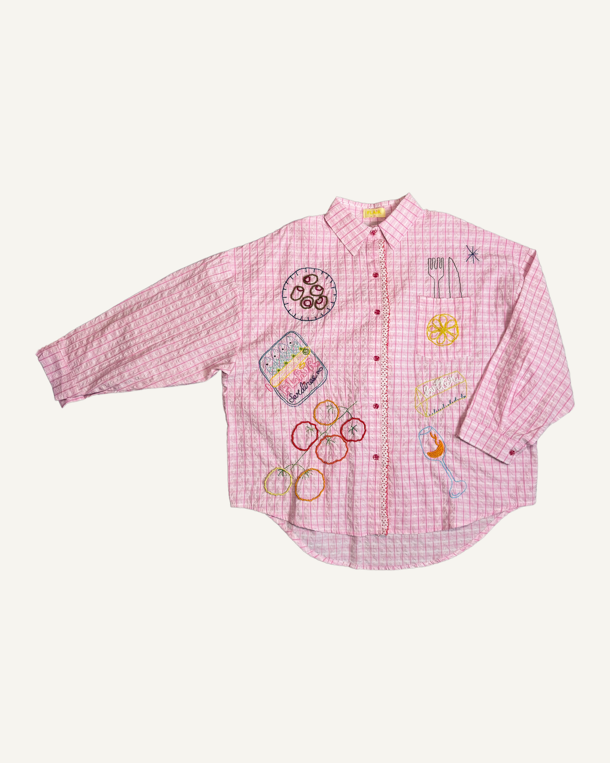 Pink seersucker, playful polka-dot lace, and a table of embroidered delights — sardine tins stamped with Flair, olives on a plate, lemon wedges, tomatoes on the vine, even a pat of butter. The Flair Sardine Club Top is whimsical yet grounded, tailored yet cheeky — a love letter to European summers and the joy of picnic details. Even the fork and knife slip out from the pocket, like a secret invite to the table.