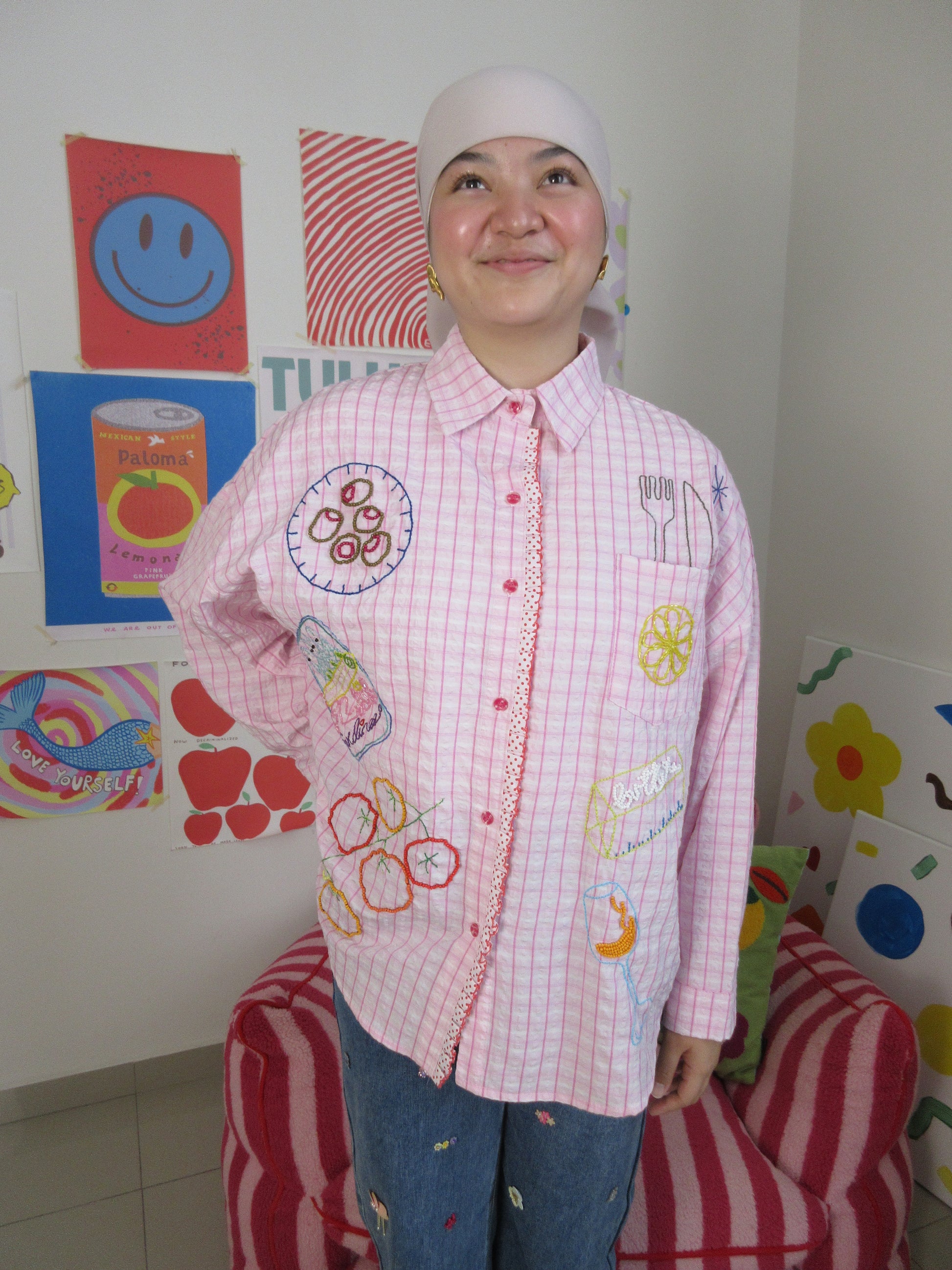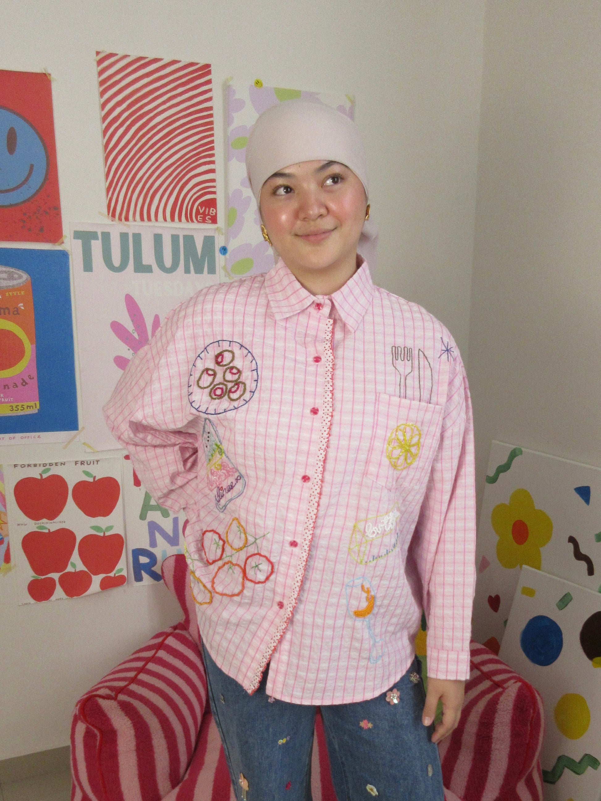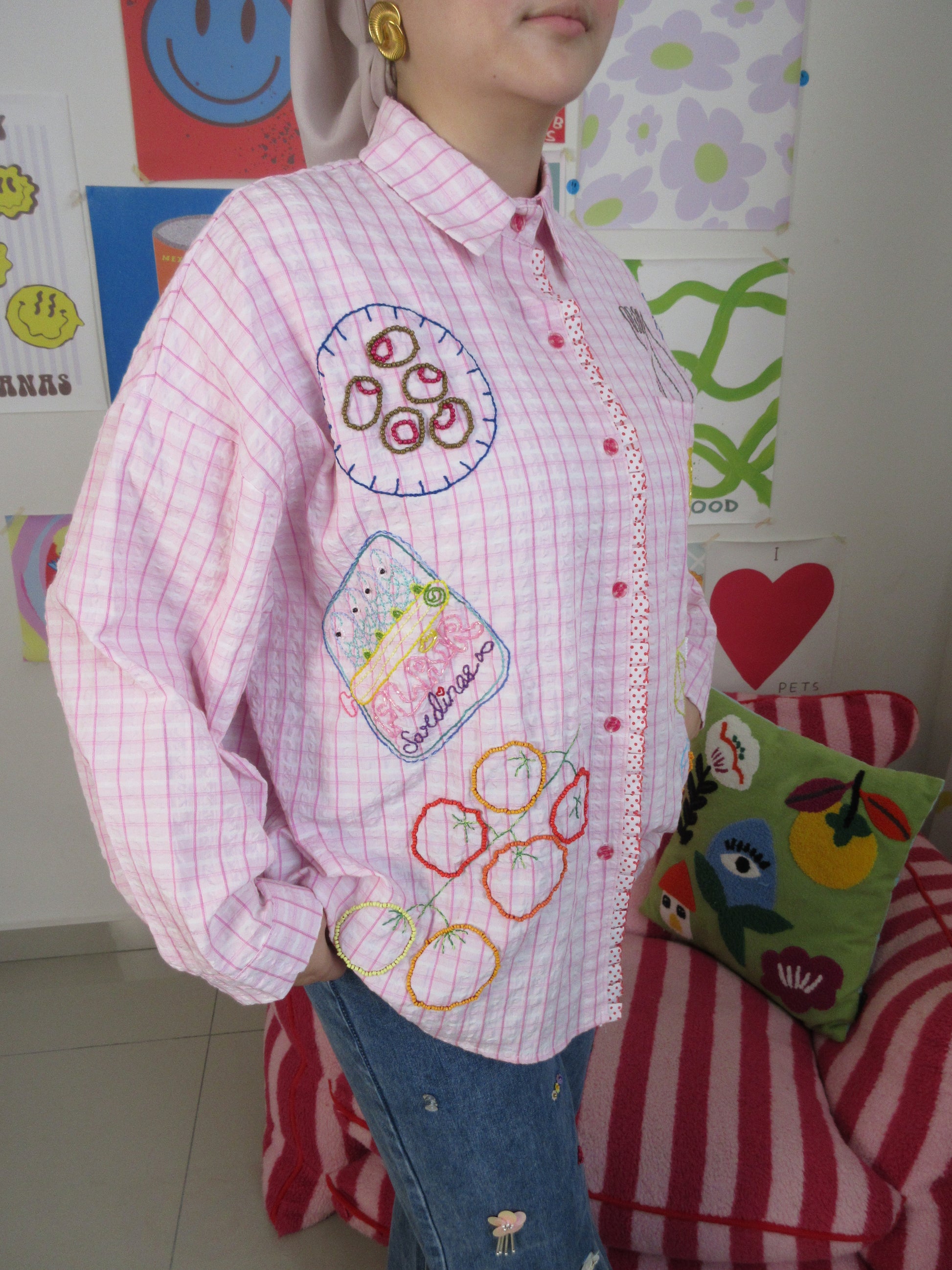 Pink seersucker, playful polka-dot lace, and a table of embroidered delights — sardine tins stamped with Flair, olives on a plate, lemon wedges, tomatoes on the vine, even a pat of butter. The Flair Sardine Club Top is whimsical yet grounded, tailored yet cheeky — a love letter to European summers and the joy of picnic details. Even the fork and knife slip out from the pocket, like a secret invite to the table.