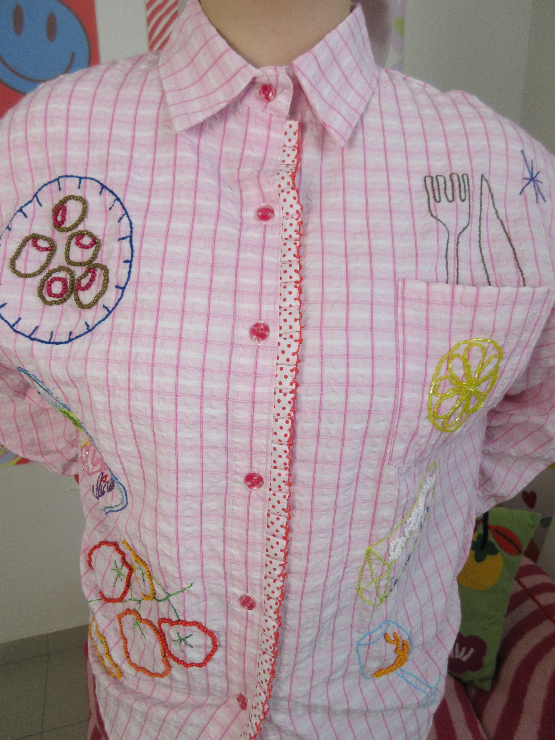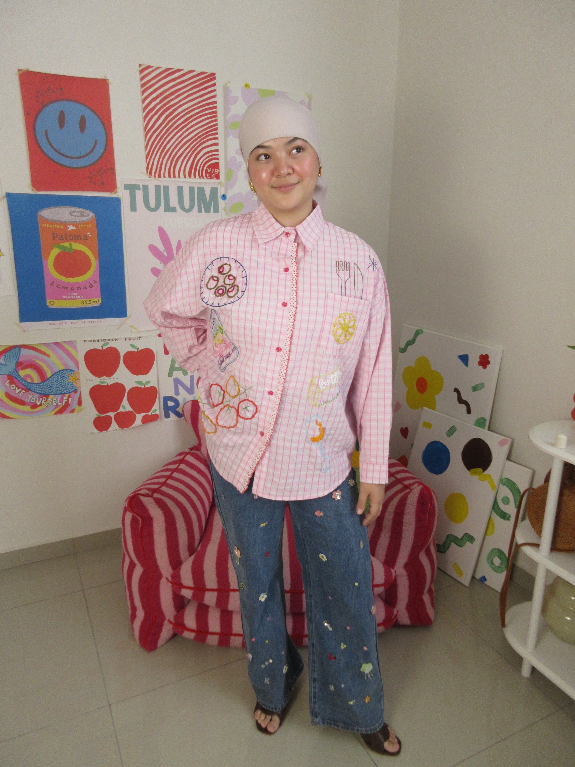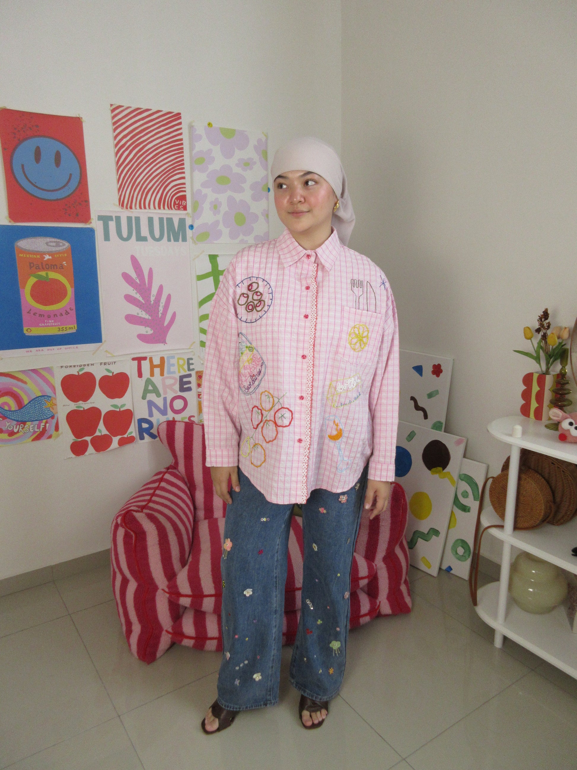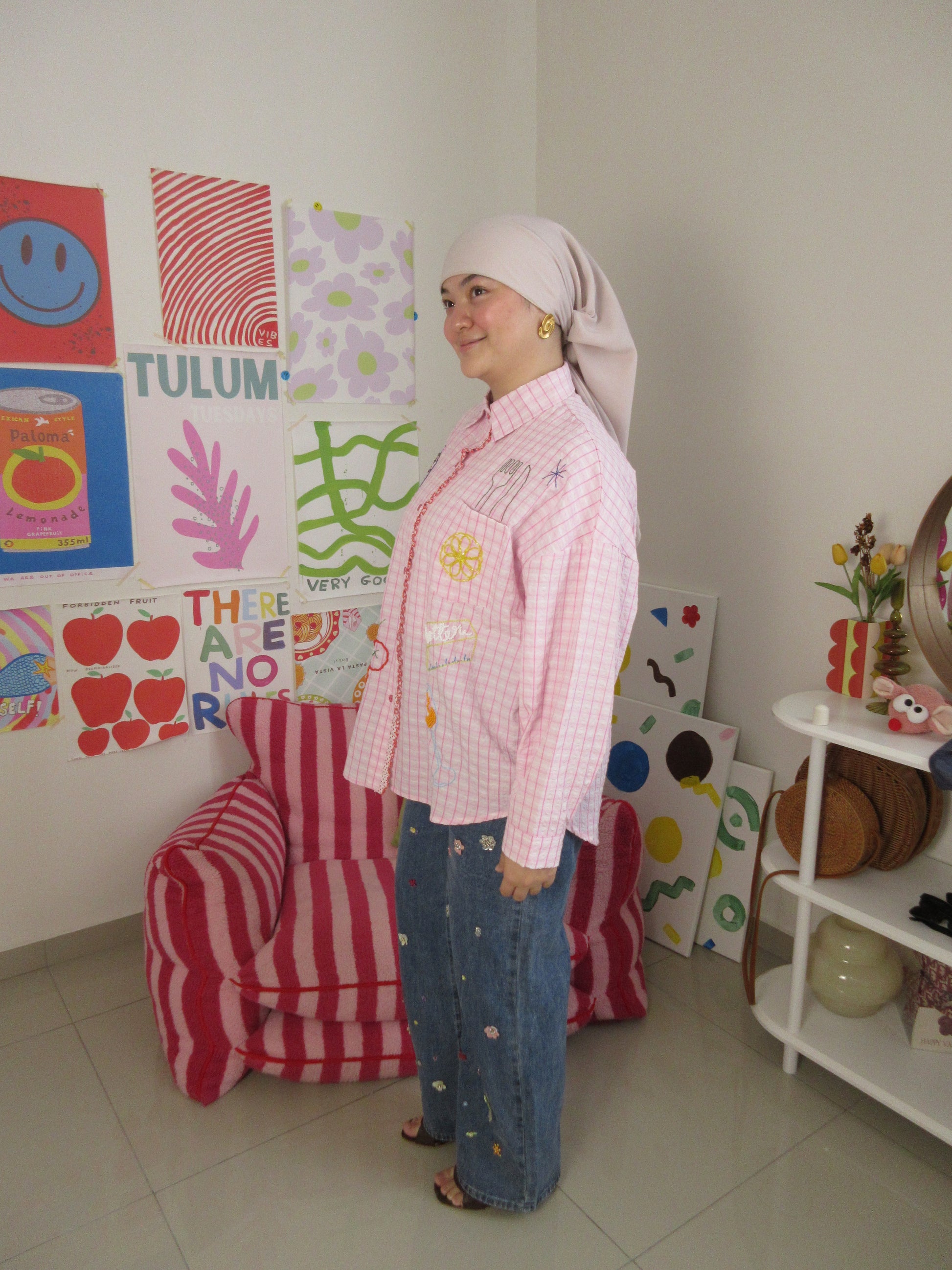 Pink seersucker, playful polka-dot lace, and a table of embroidered delights — sardine tins stamped with Flair, olives on a plate, lemon wedges, tomatoes on the vine, even a pat of butter. The Flair Sardine Club Top is whimsical yet grounded, tailored yet cheeky — a love letter to European summers and the joy of picnic details. Even the fork and knife slip out from the pocket, like a secret invite to the table.