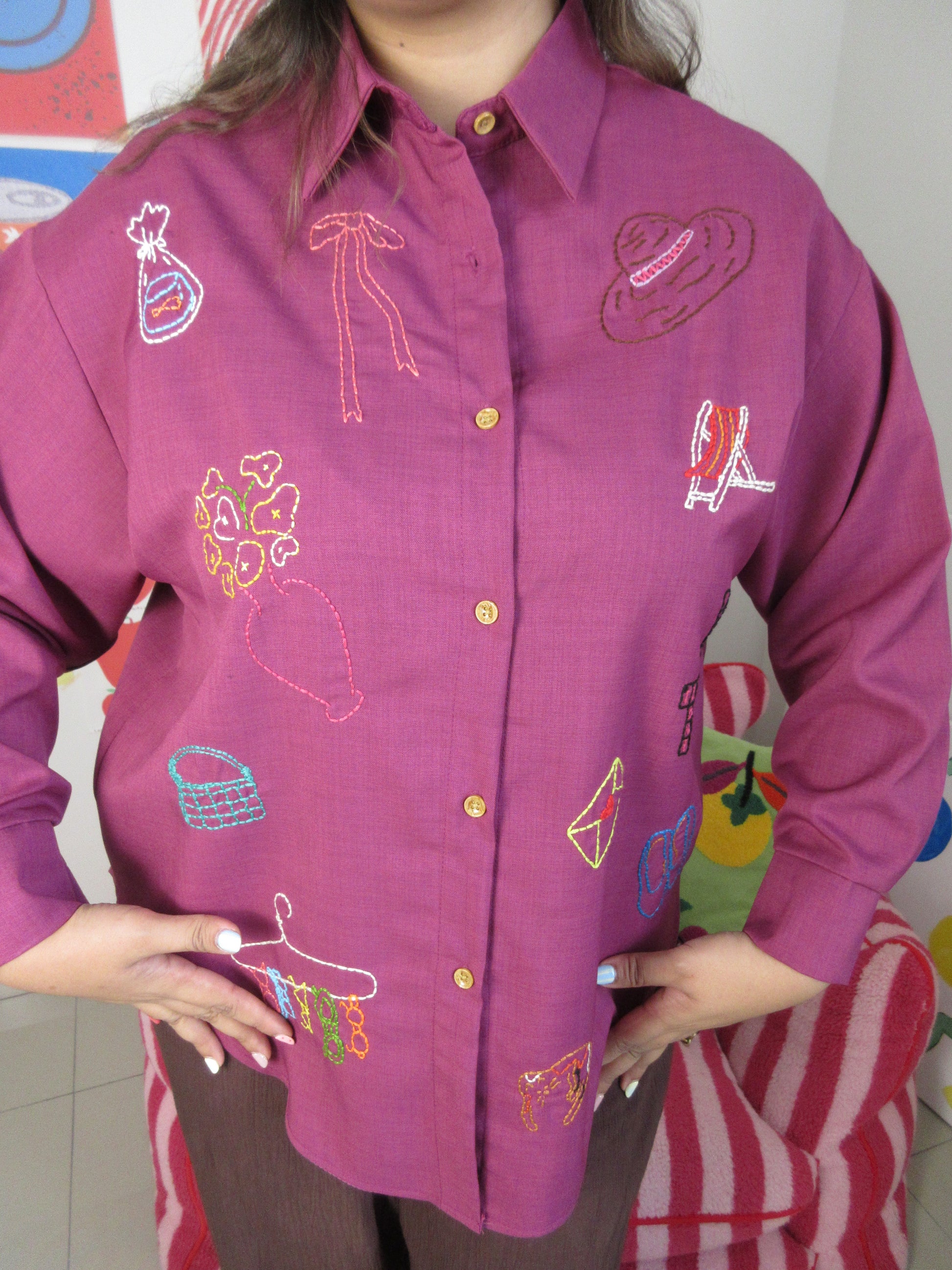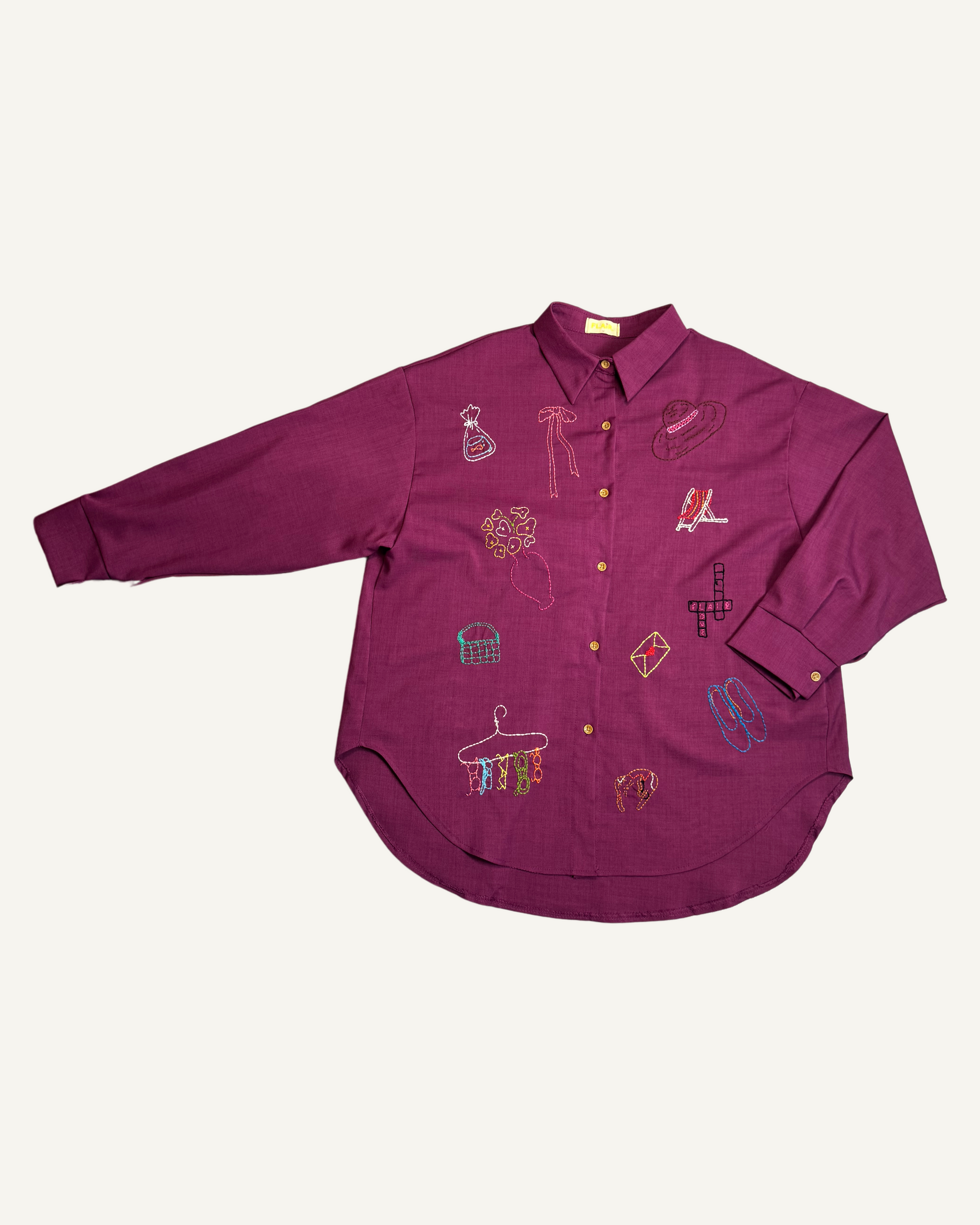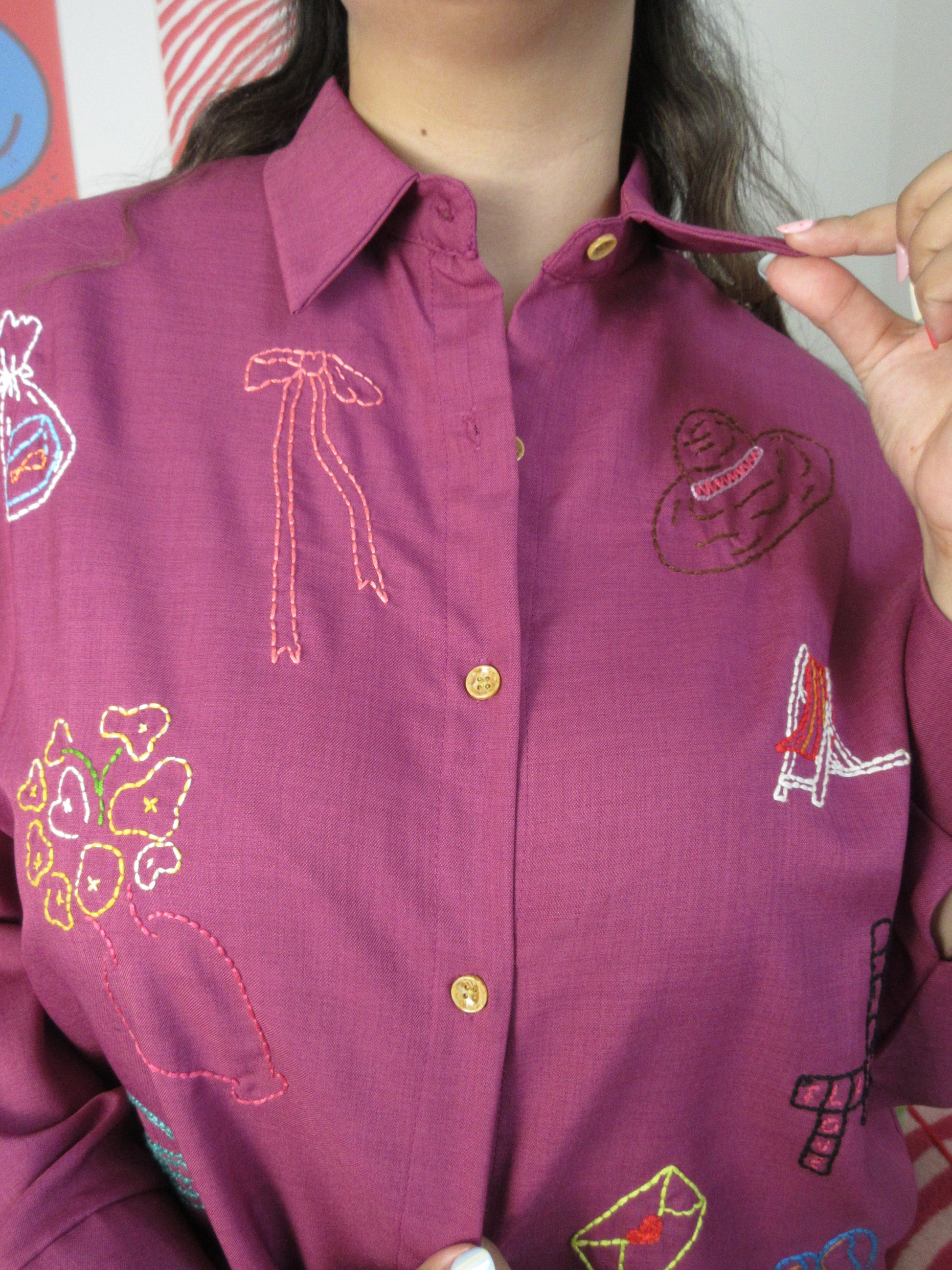 In plum cotton with soft volume and airy ease, the Picnic Planner Top is stitched with the sweetest summer story — embroidered sunnies, ballet flats, a calico cat, a handbag, scrabble tiles, and a wide-brim sunhat. It’s effortless, whimsical, and just a touch nostalgic — like drifting off on a picnic blanket and waking up chic.