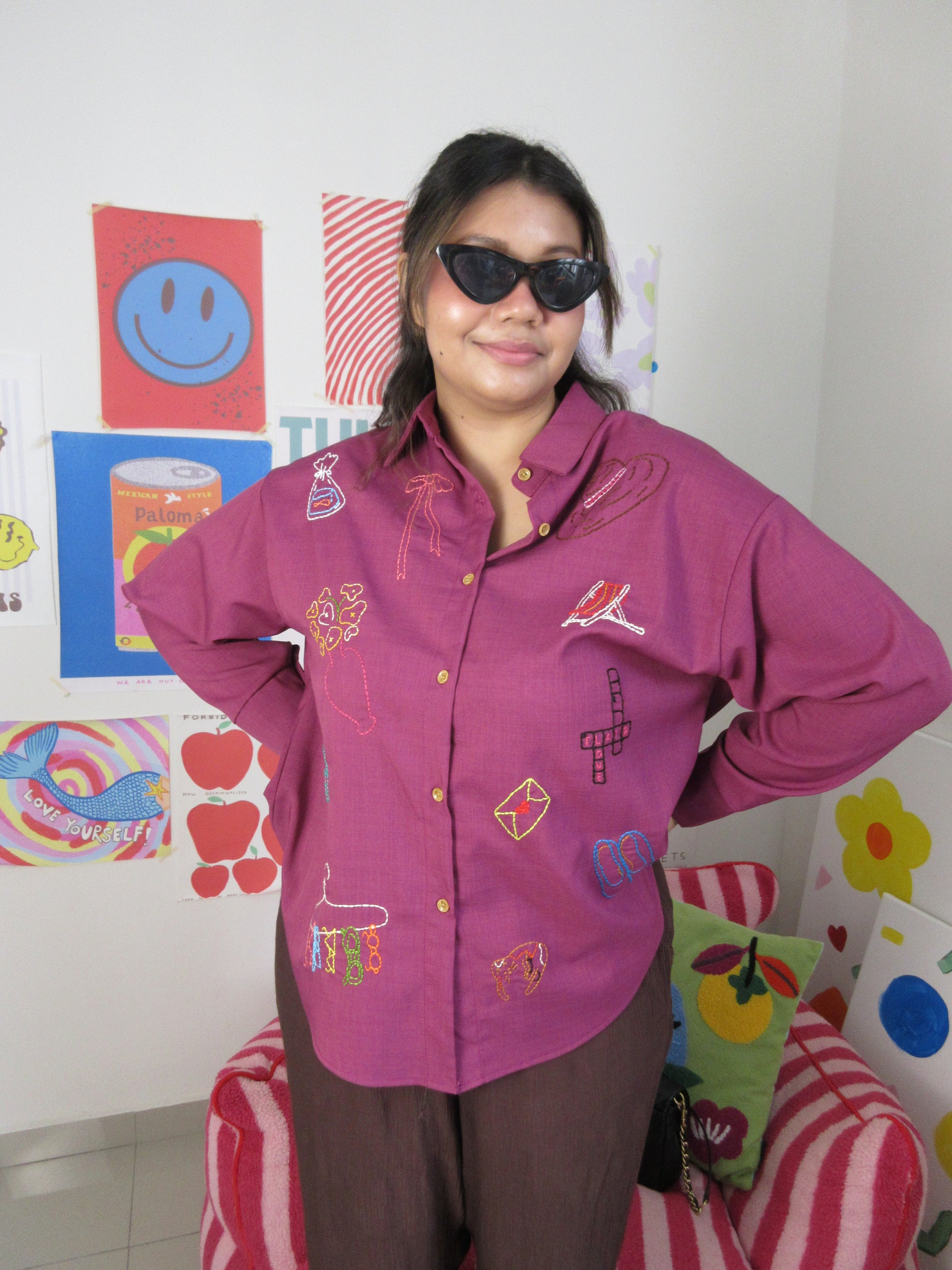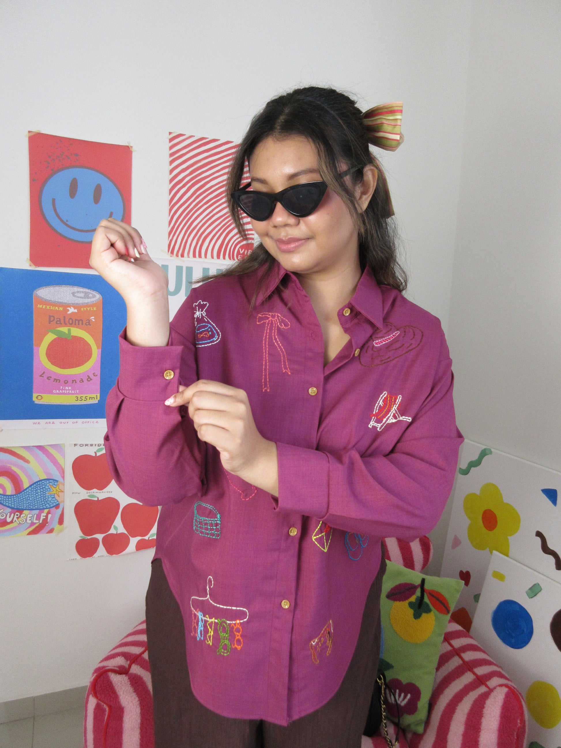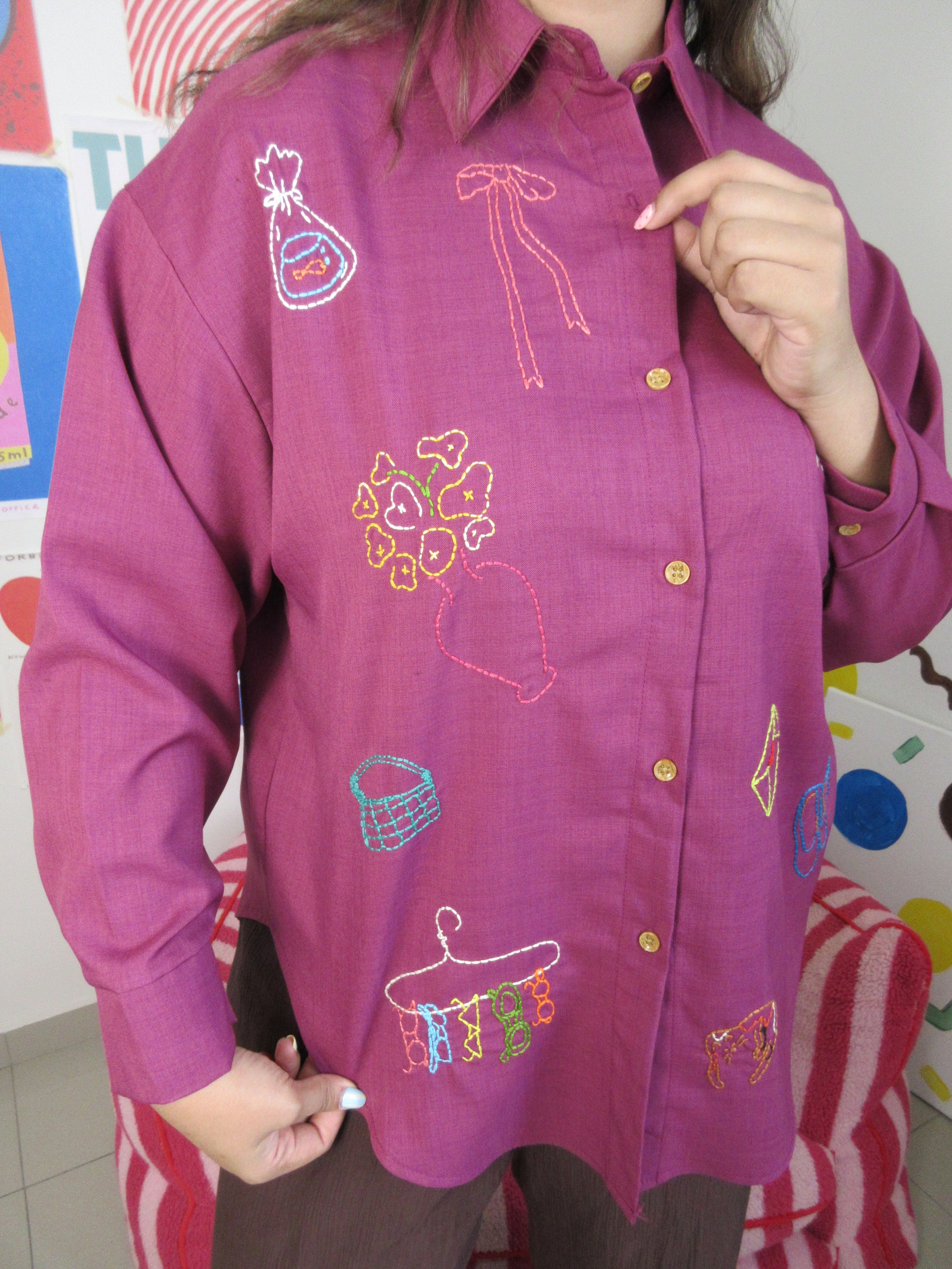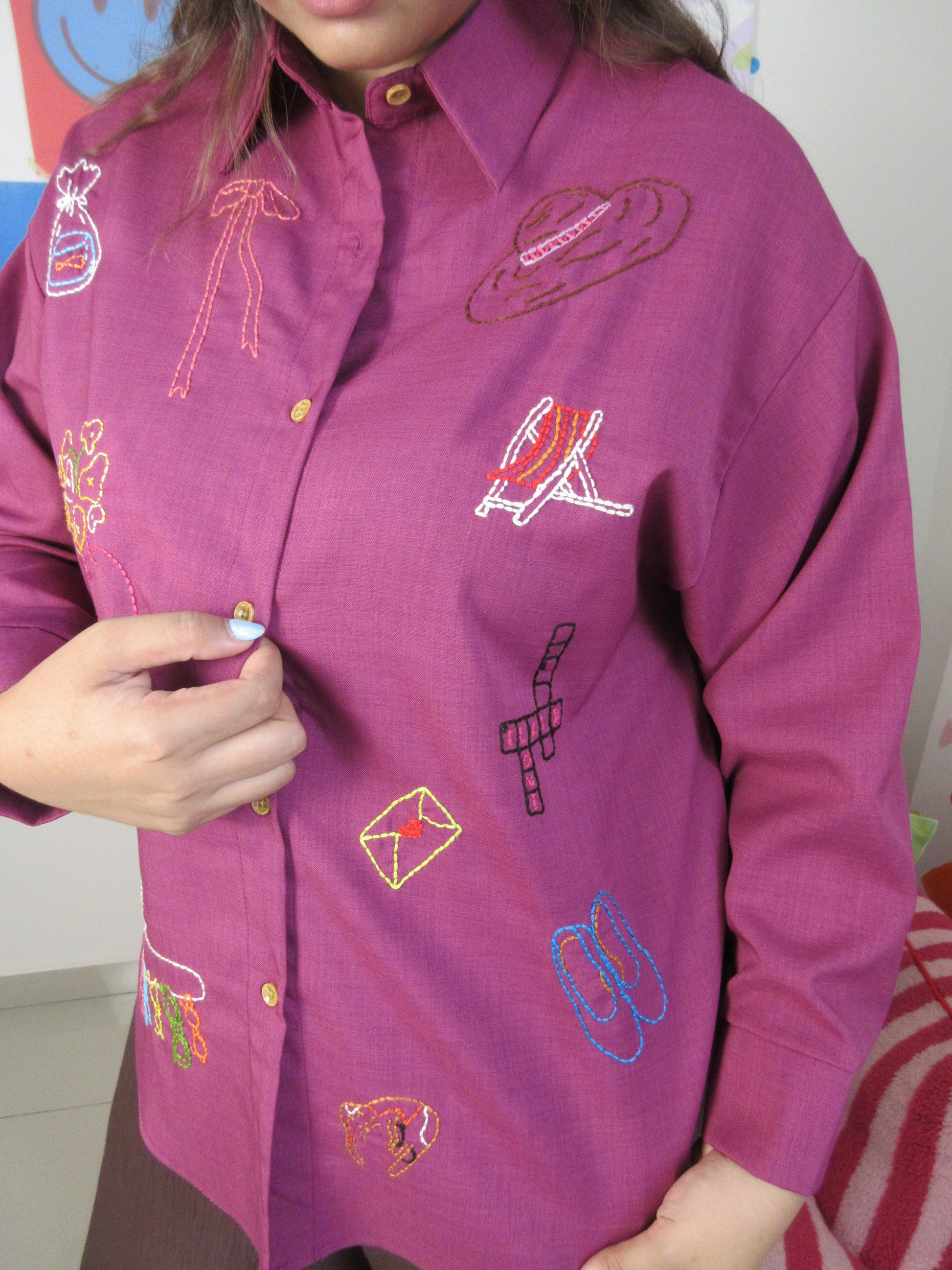 In plum cotton with soft volume and airy ease, the Picnic Planner Top is stitched with the sweetest summer story — embroidered sunnies, ballet flats, a calico cat, a handbag, scrabble tiles, and a wide-brim sunhat. It’s effortless, whimsical, and just a touch nostalgic — like drifting off on a picnic blanket and waking up chic.