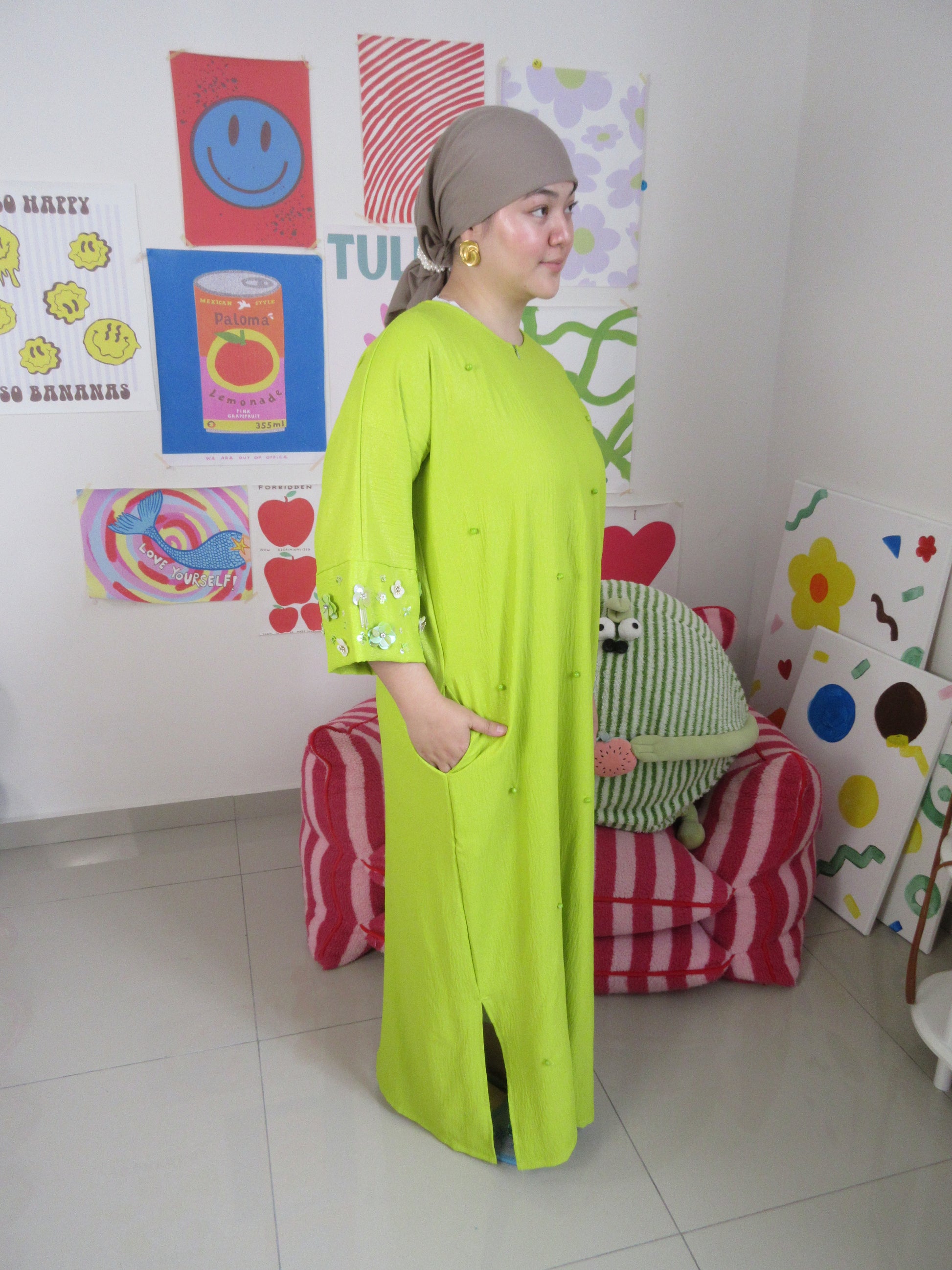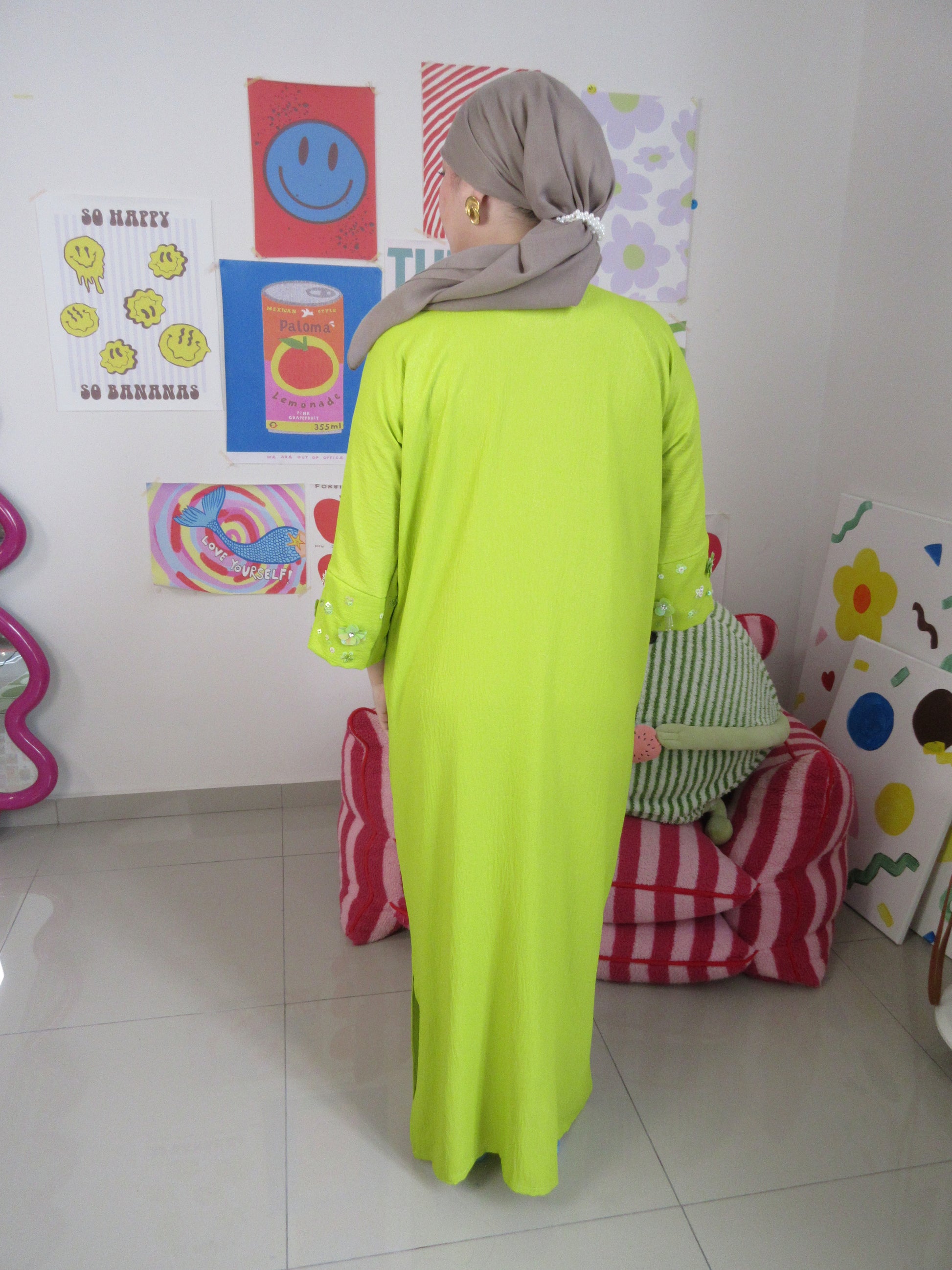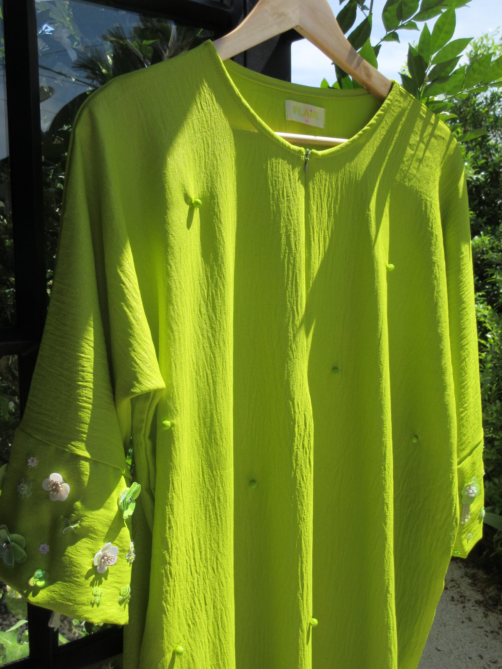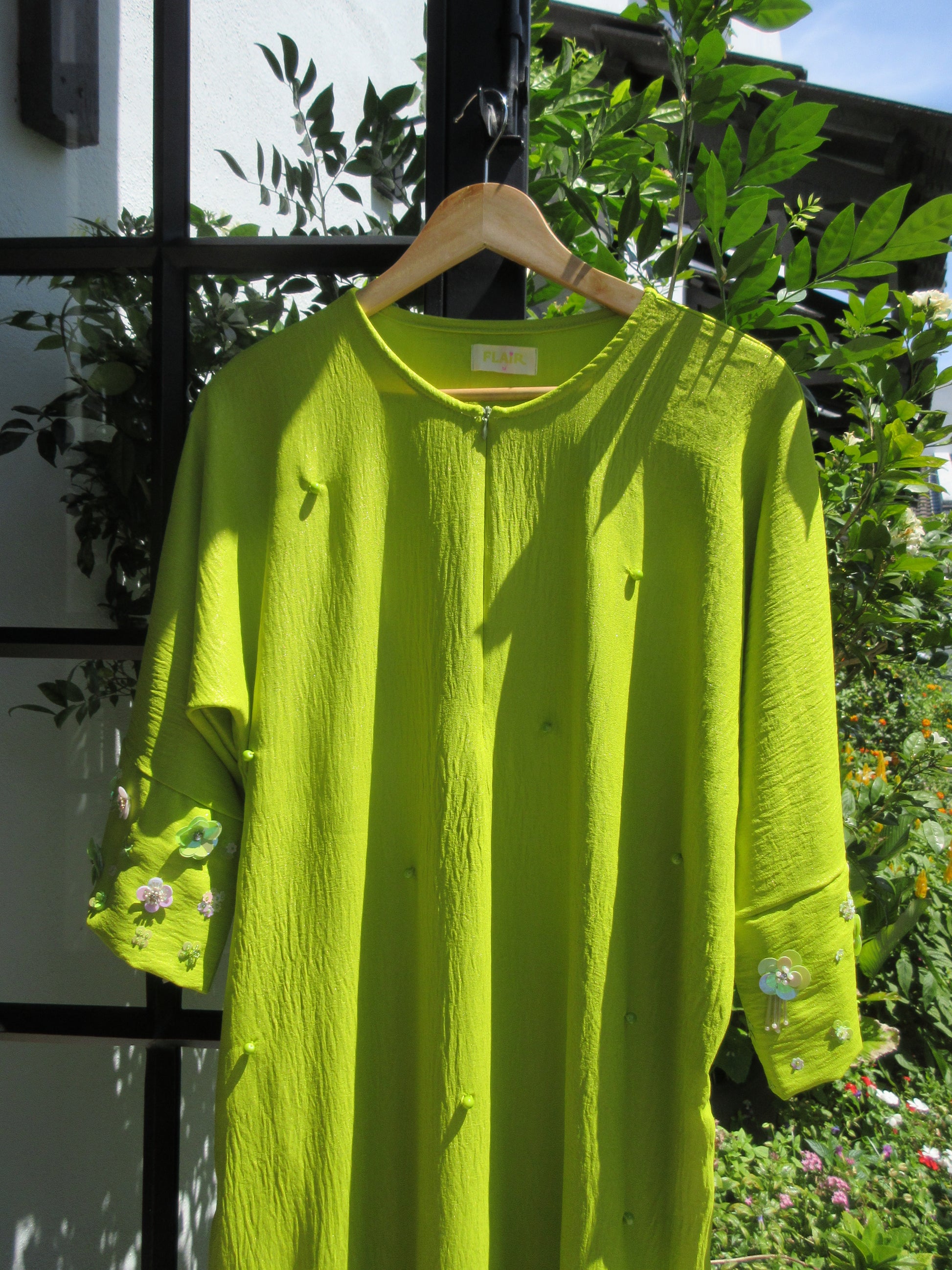 A love letter to flower fields and sun-drenched afternoons, The All-Dayer is the kind of dress you wear when you want to feel soft and powerful. Crafted from ethereal Cypress Shimmer fabric, it catches the light with every step — like a daydream in motion. With dramatic batwing sleeves, delicate 3D floral embellishments, and hand-sewn sequins and beads, this maxi is a walking garden party. Scattered pearls stitched across the body add a dewy, enchanted touch. Designed to make you bloom from day to dusk.