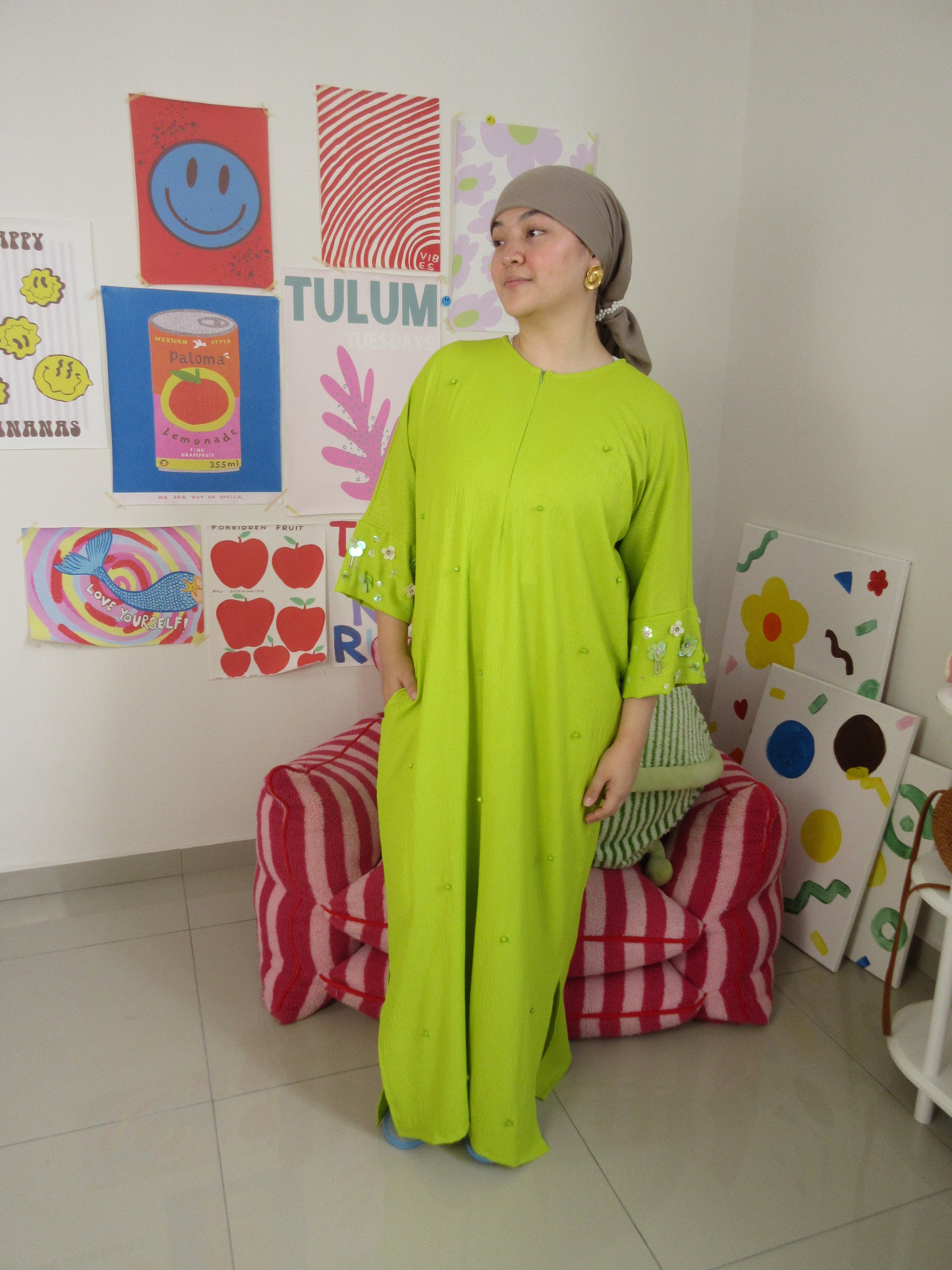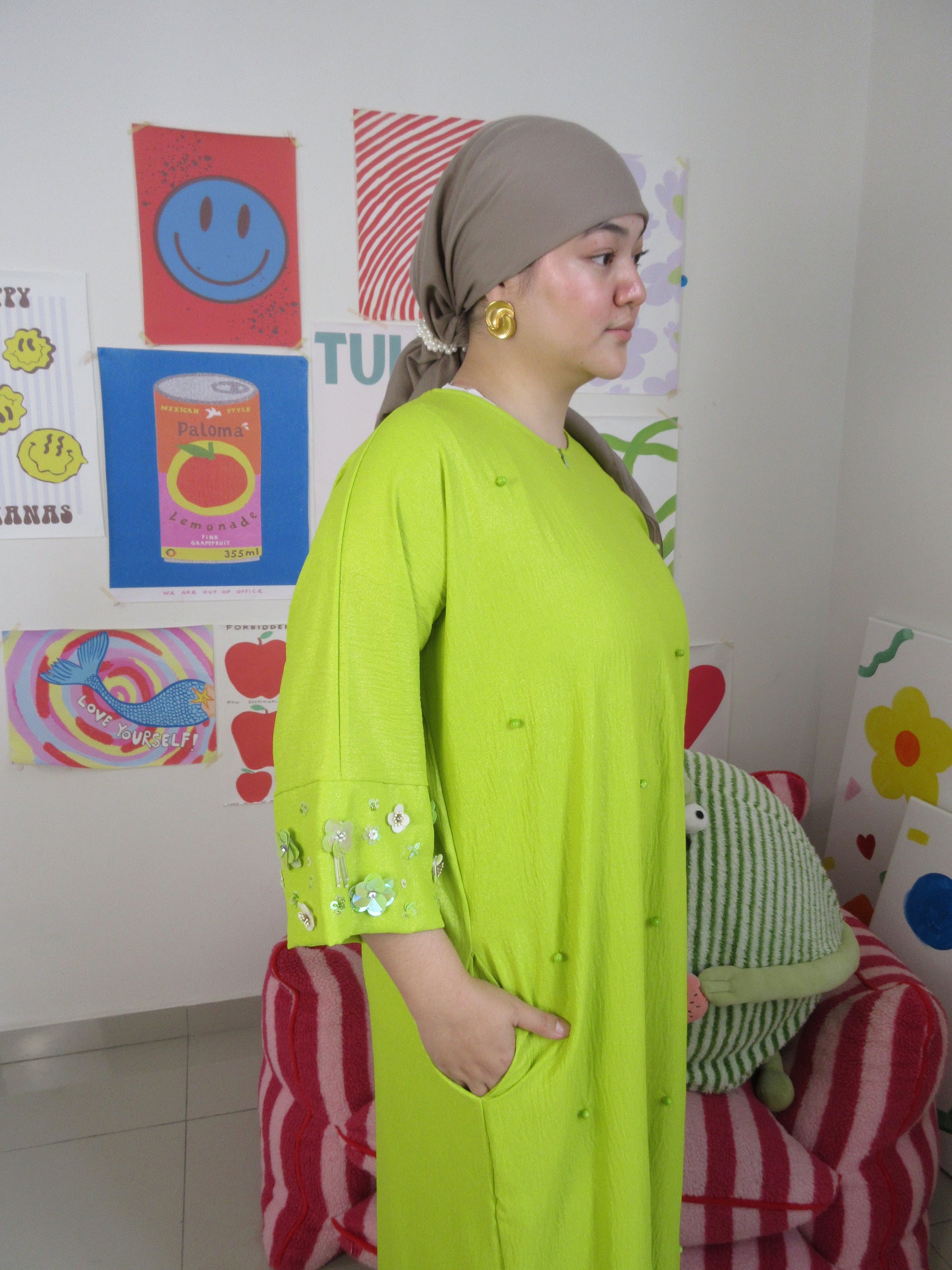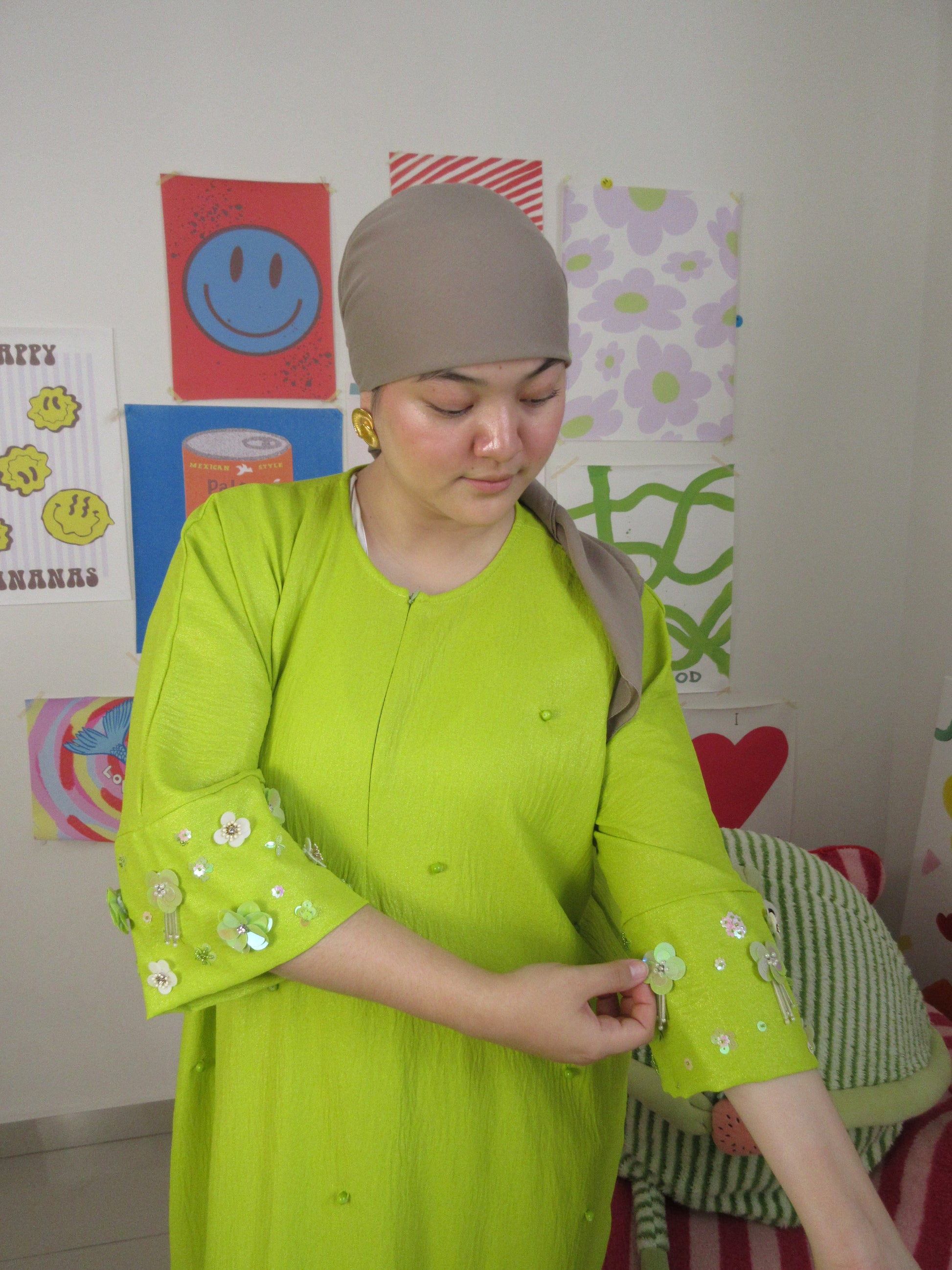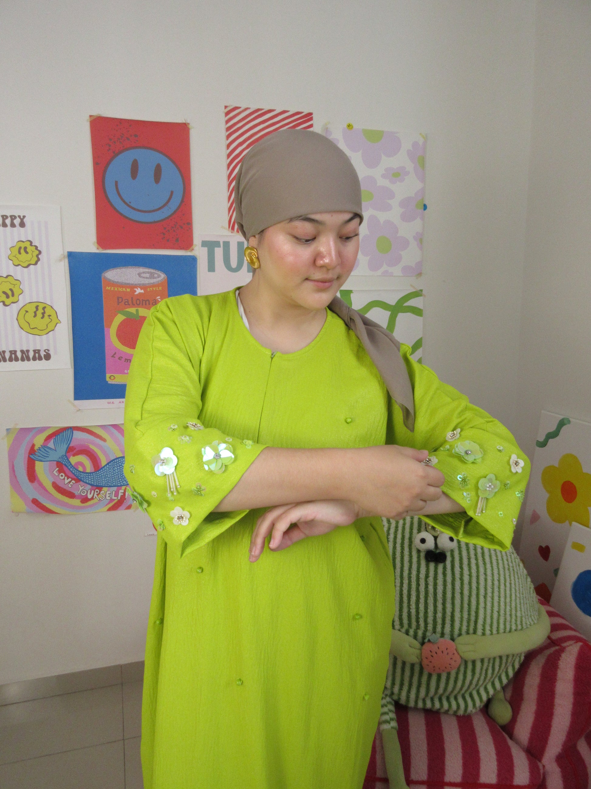 A love letter to flower fields and sun-drenched afternoons, The All-Dayer is the kind of dress you wear when you want to feel soft and powerful. Crafted from ethereal Cypress Shimmer fabric, it catches the light with every step — like a daydream in motion. With dramatic batwing sleeves, delicate 3D floral embellishments, and hand-sewn sequins and beads, this maxi is a walking garden party. Scattered pearls stitched across the body add a dewy, enchanted touch. Designed to make you bloom from day to dusk.