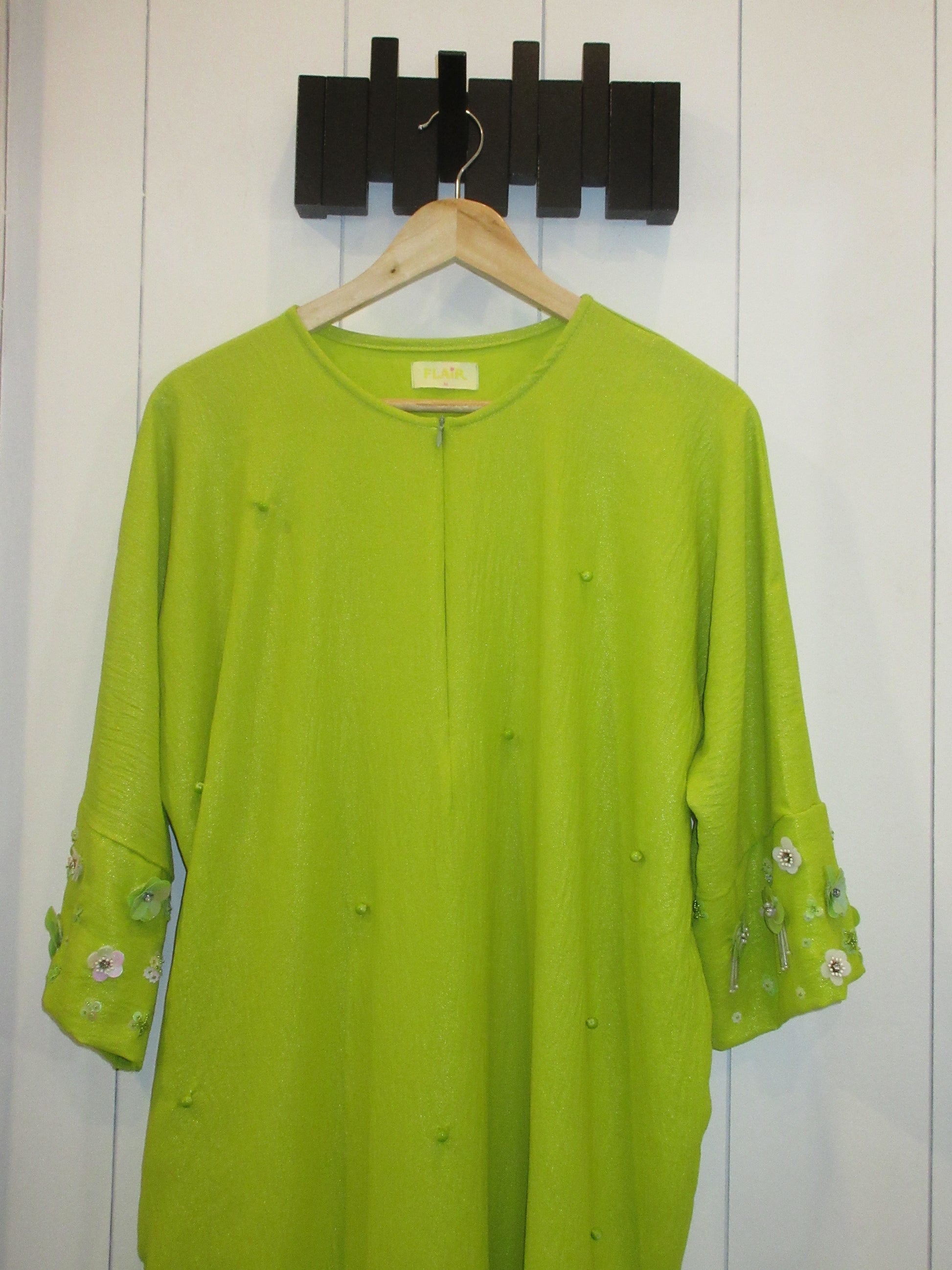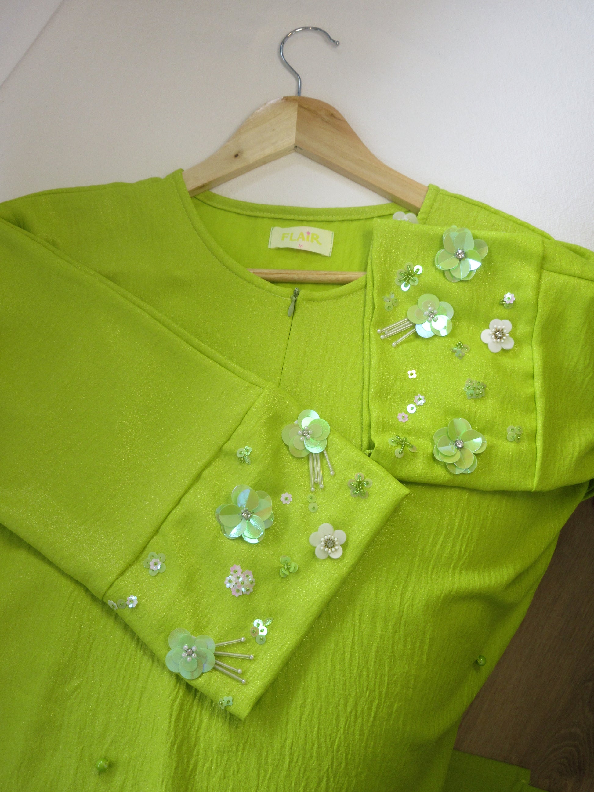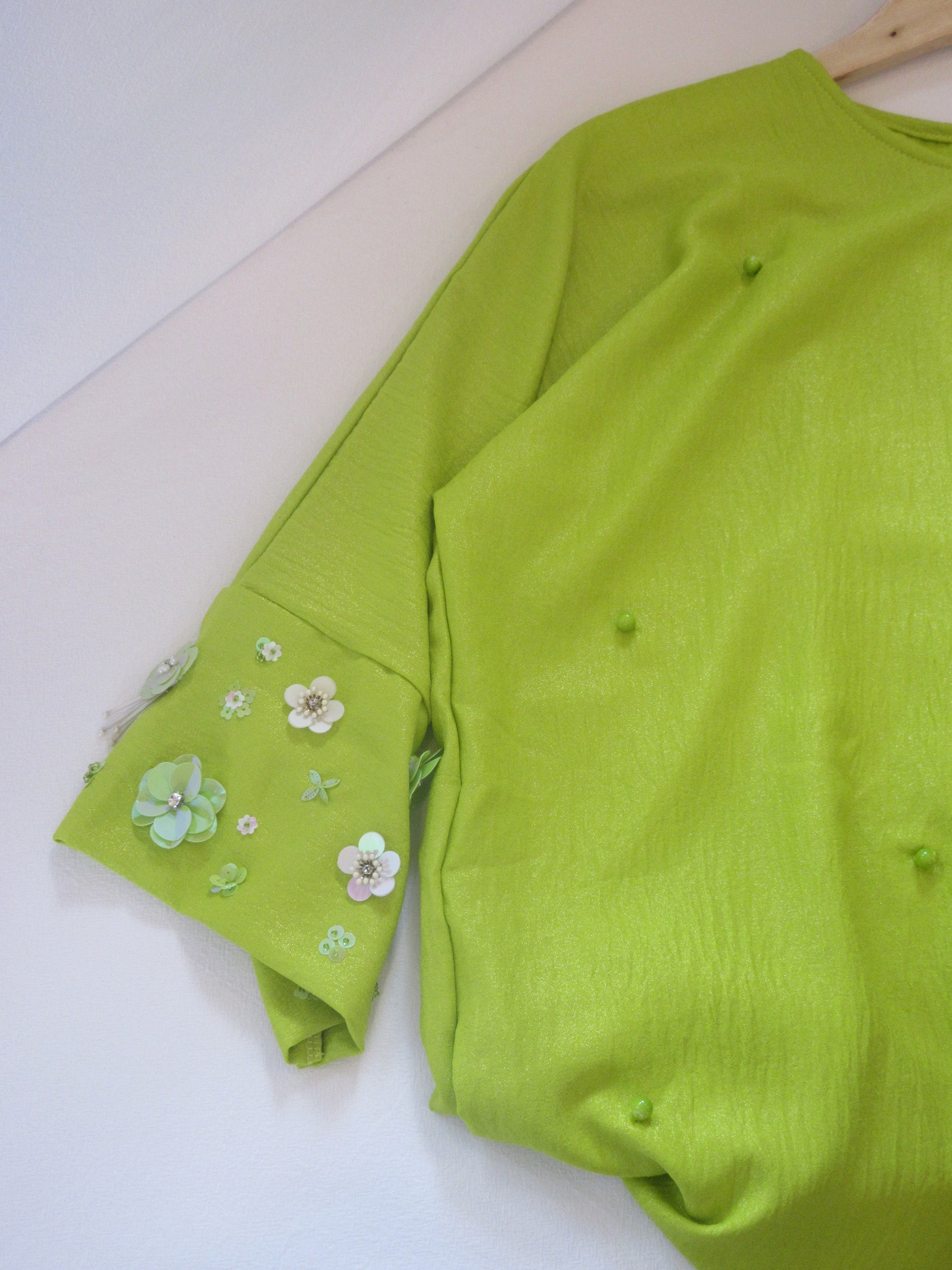 - Hand-sewn 3D floral detailing, sequins and beadwork on both sleeves