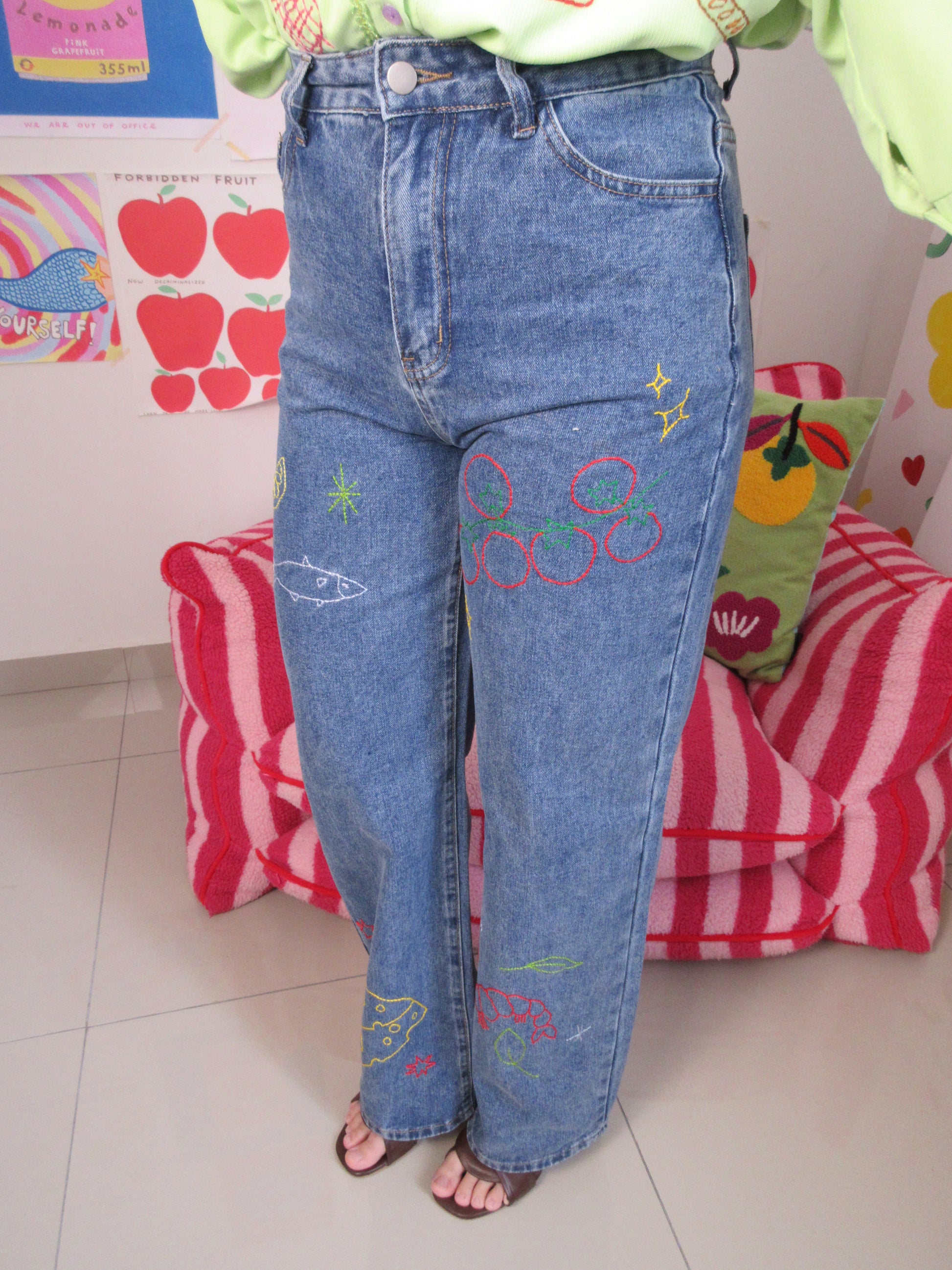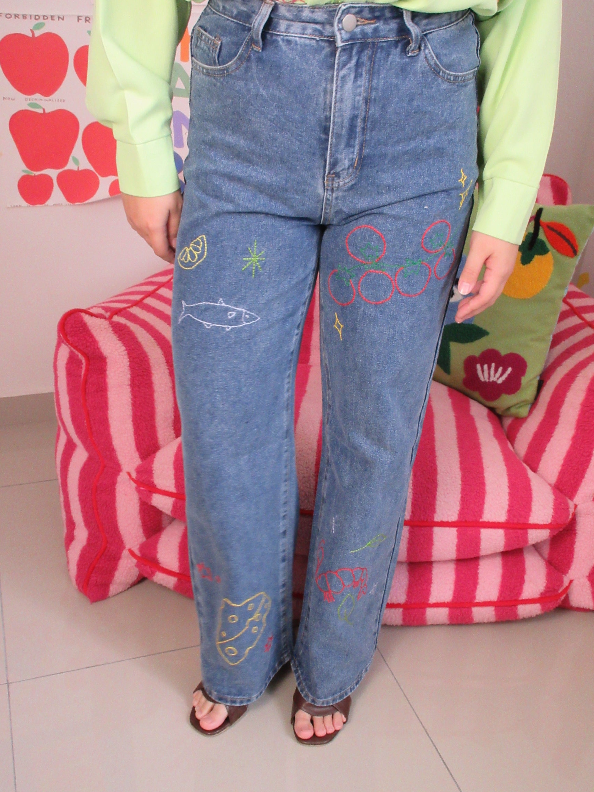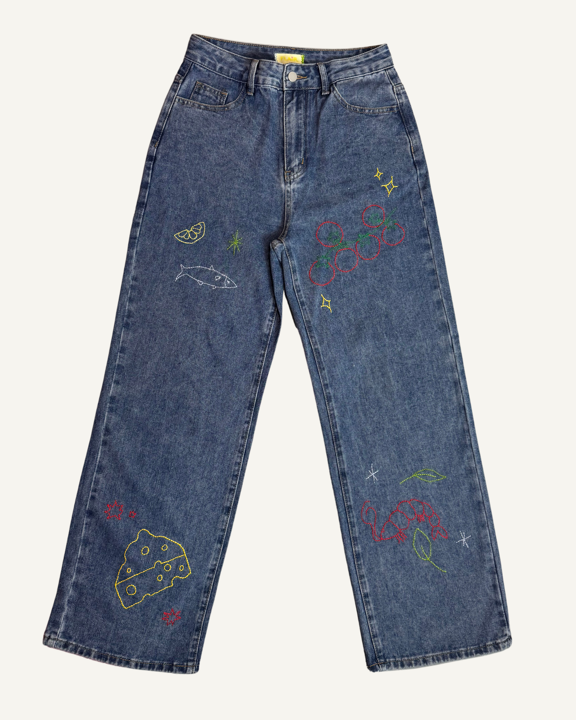 A charcuterie board, but make it denim. The Tomatina Jeans serve vine-ripened tomatoes, cheese wheels, sardines, herbs, and lemon slices — embroidered and beaded with care, like a picnic spread stitched to last forever. Cheeky yet chic, they’re denim for the girl who knows life’s best moments are collected like recipes, meant to be savoured and shared.