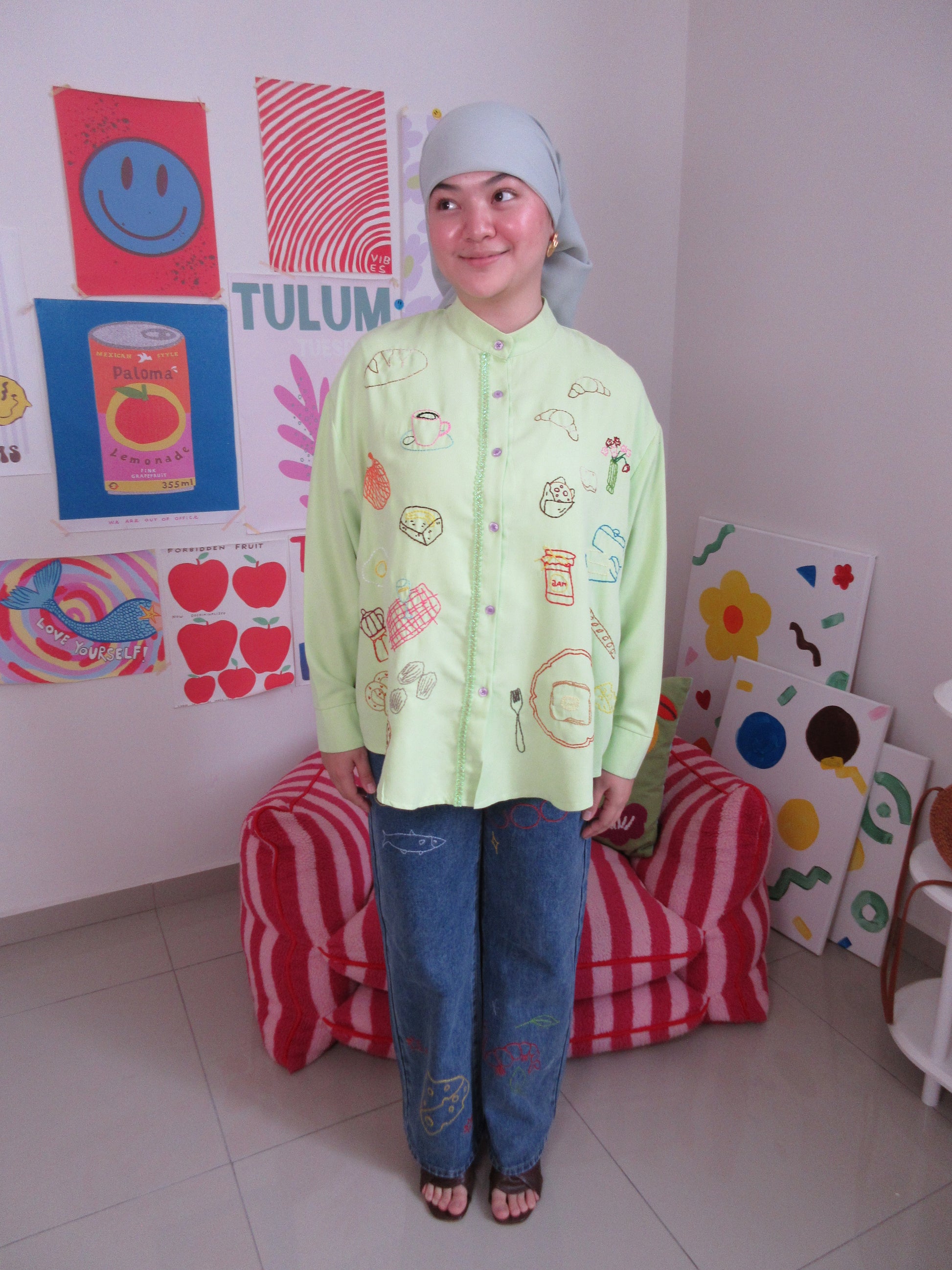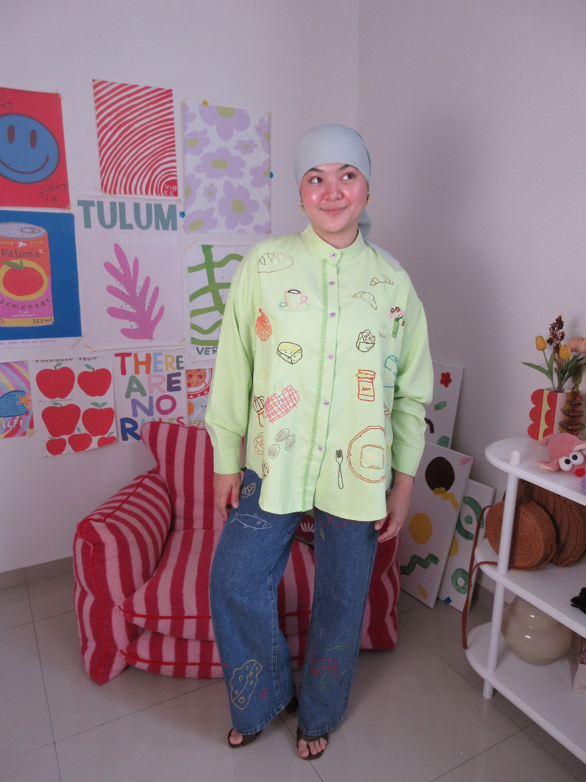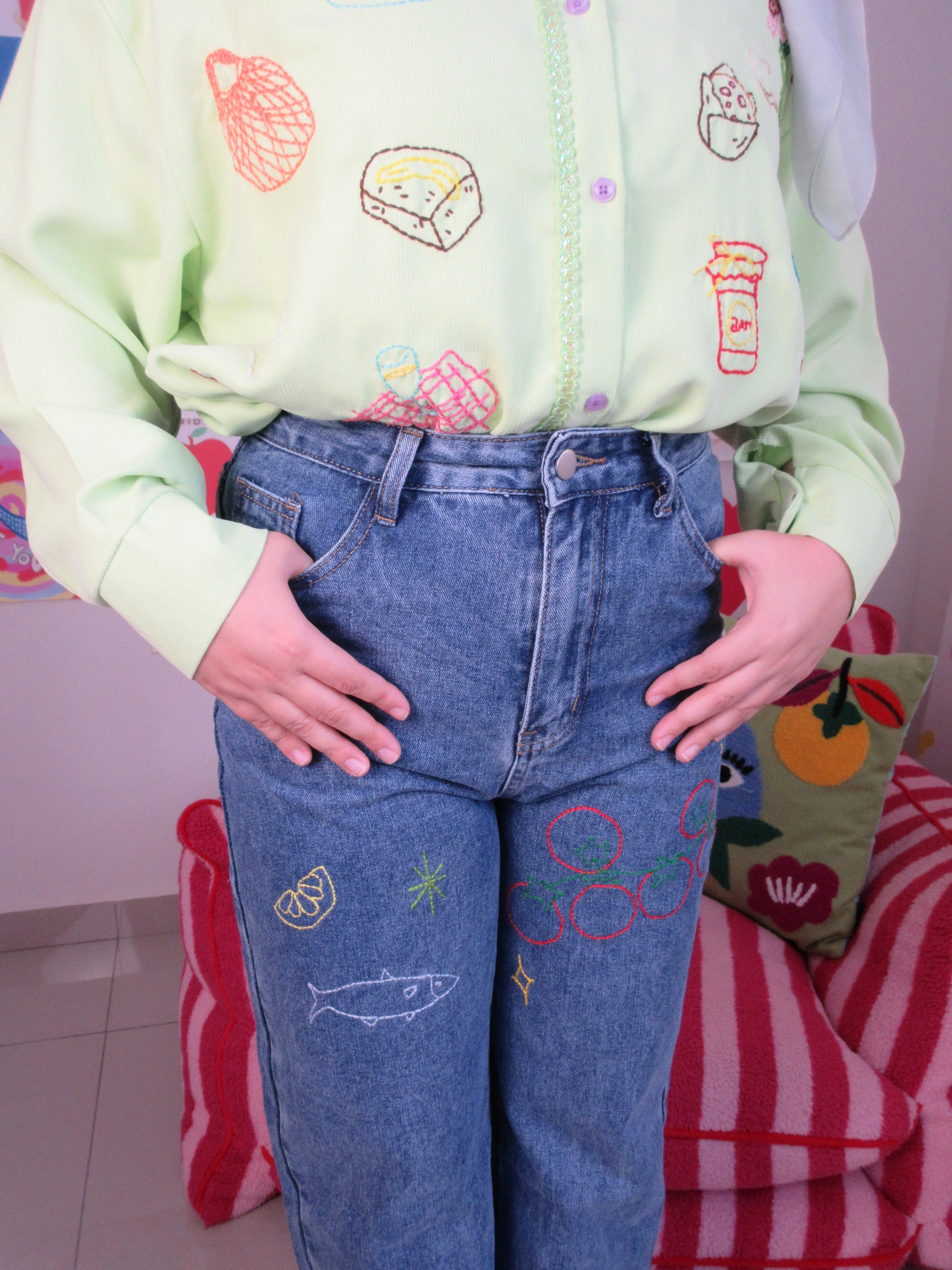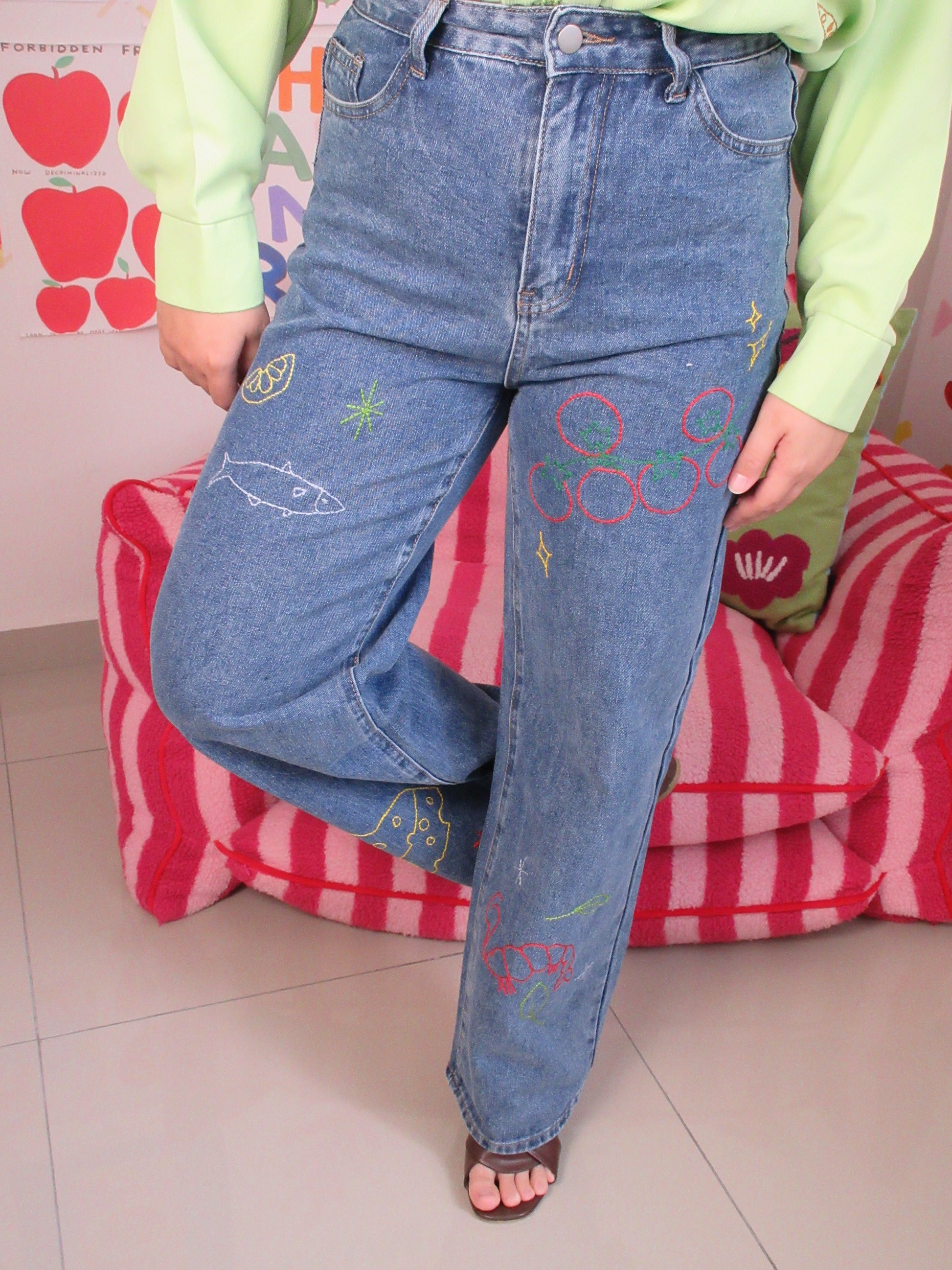 A charcuterie board, but make it denim. The Tomatina Jeans serve vine-ripened tomatoes, cheese wheels, sardines, herbs, and lemon slices — embroidered and beaded with care, like a picnic spread stitched to last forever. Cheeky yet chic, they’re denim for the girl who knows life’s best moments are collected like recipes, meant to be savoured and shared.